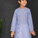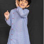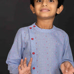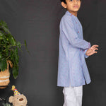 Refined and stylish, this boys' kurta set is crafted from soft cotton dobby fabric, offering a subtle texture and breathable comfort. The kurta features a sleek mandarin collar and an asymmetric front opening, enhanced by contrast red fabric buttons and piping on the sleeves for a touch of elegance. Paired with classic white straight-cut cotton pants with a fully elasticated waistband and convenient pockets, this outfit ensures both sophistication and ease. Perfect for festive occasions or special gatherings.
