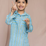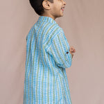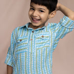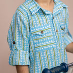 Pair it with any matching set of pants, this Sky Blue Kantha Work Kurta is a blend of comfort and style. Made from soft printed cotton, the kurta features kantha work, a sharp pointed collar, and a curved hemline for a modern touch. Roll-up sleeves with loop and button fastening add versatility, while two front pockets with horizontal stripe details, flaps, and buttons add both charm and functionality.