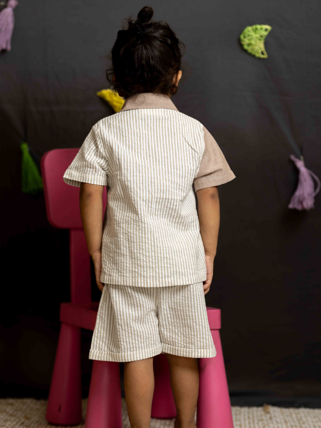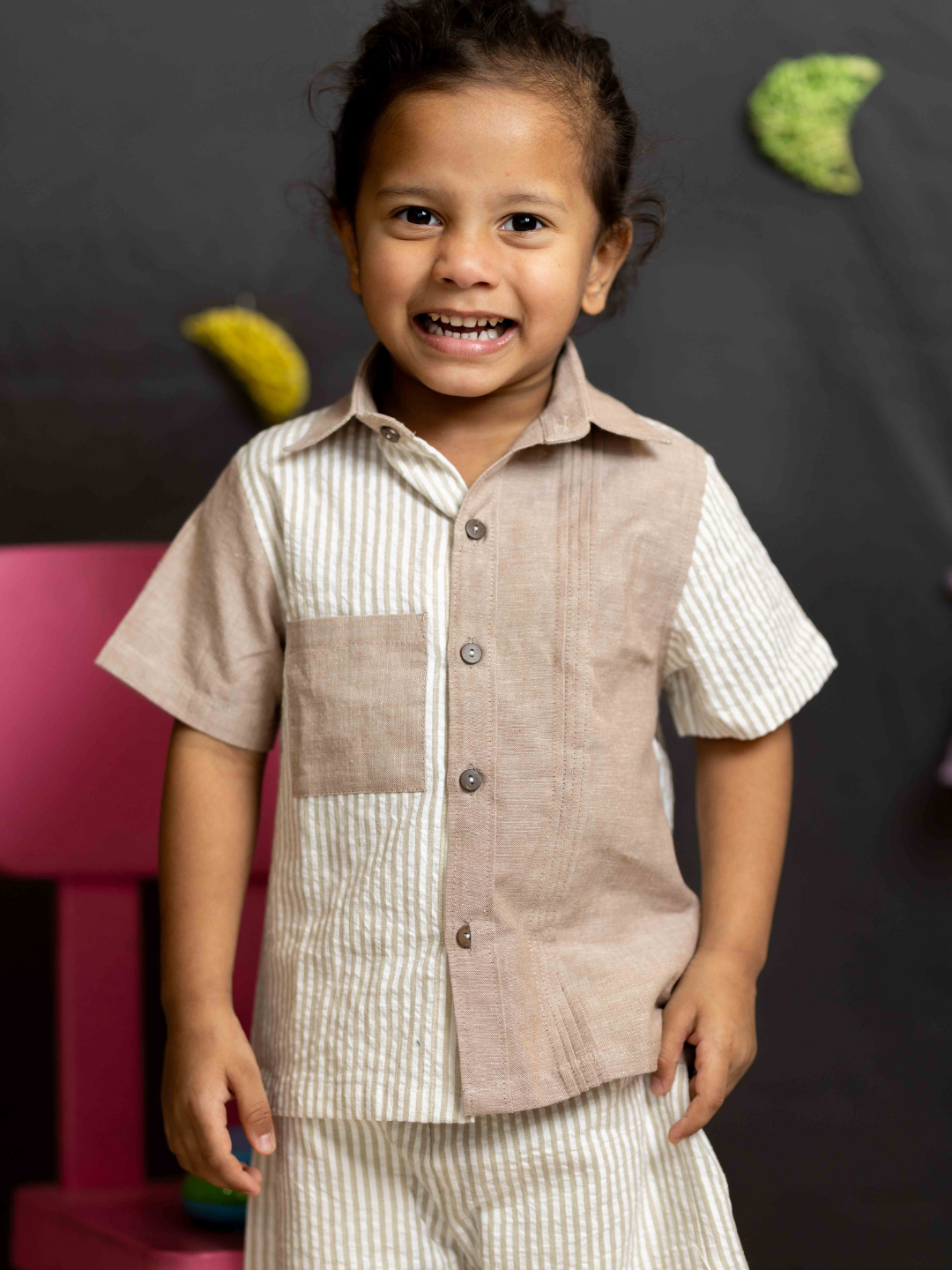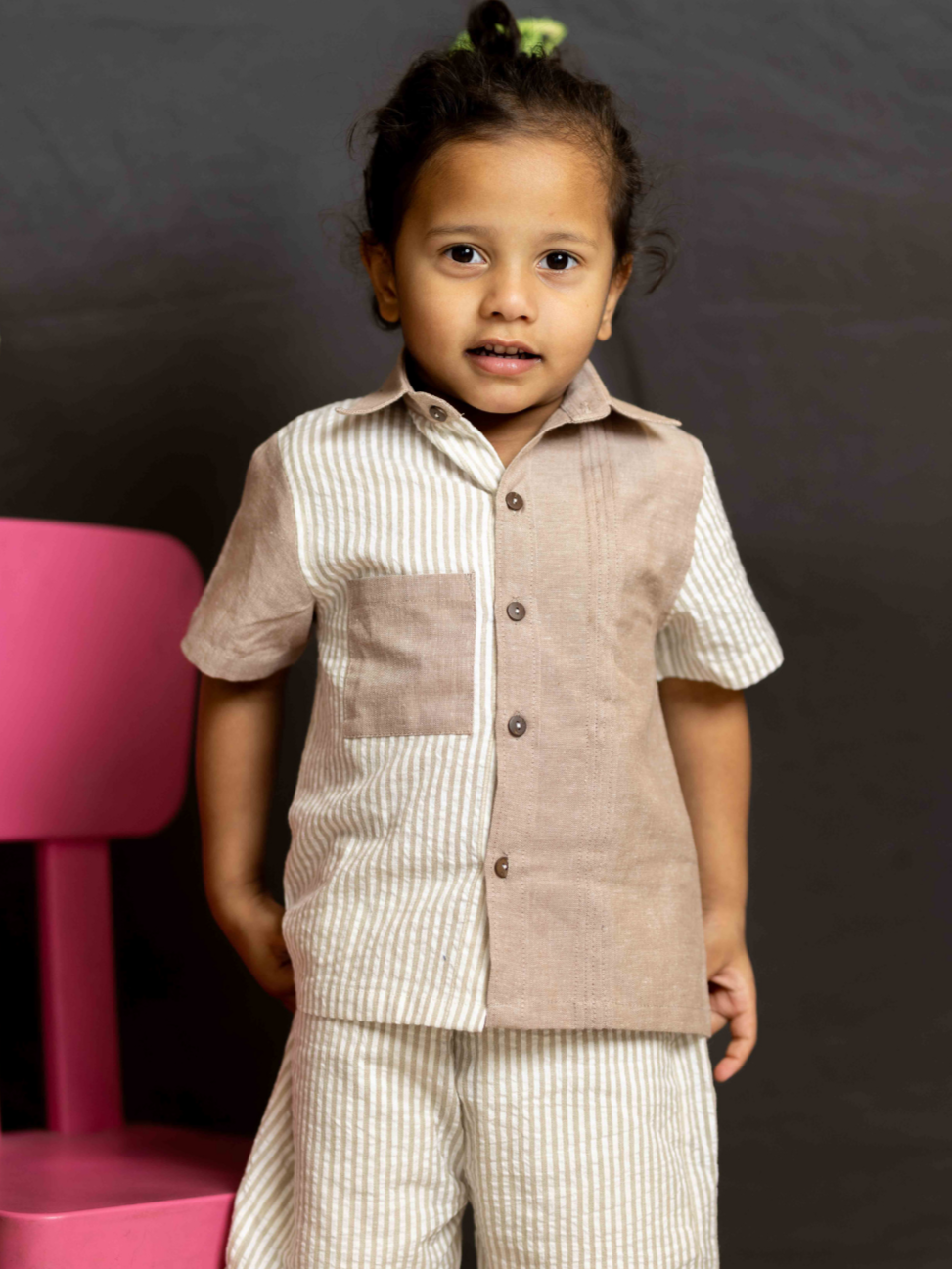 Shirt has mismatched solid and striped panels for a quirky look.