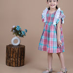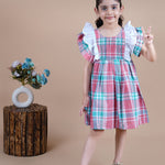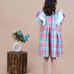 - Coral and blue yarn dyed cotton checks dress with soft cotton lining and gathers at the waist.