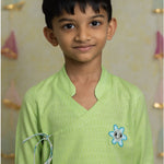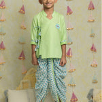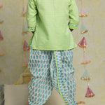 Dress your little boy in the charming Green Jacquard and Printed Dhoti Set, a perfect blend of tradition and style. This outfit is designed to provide comfort while making your child stand out in festive gatherings.