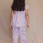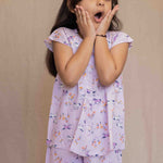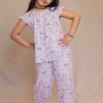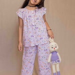 This adorable lilac-colored rayon nightsuit for girls is designed with an all-over horse print, perfect for a cozy night’s sleep. The top features a flared fit and matching flared sleeves, adding a playful and stylish touch. The elasticated pants ensure a comfortable fit and are finished with contrast white piping near the bottom edge for added charm. Made from soft and breathable fabric, this nightsuit promises comfort all night long.