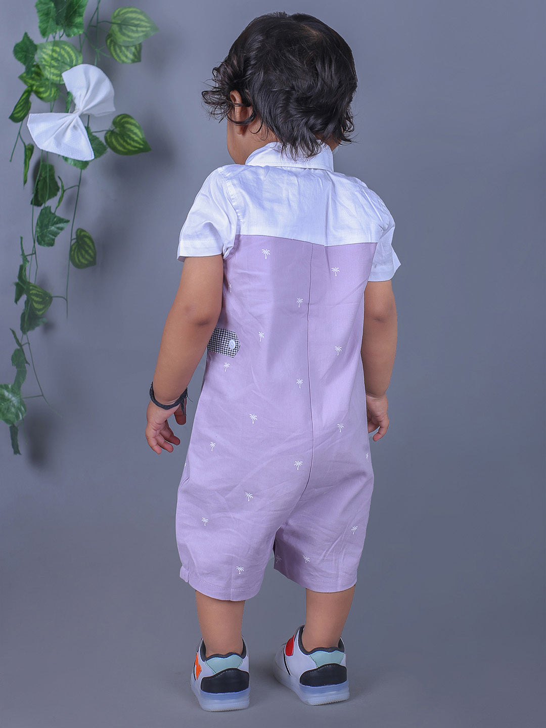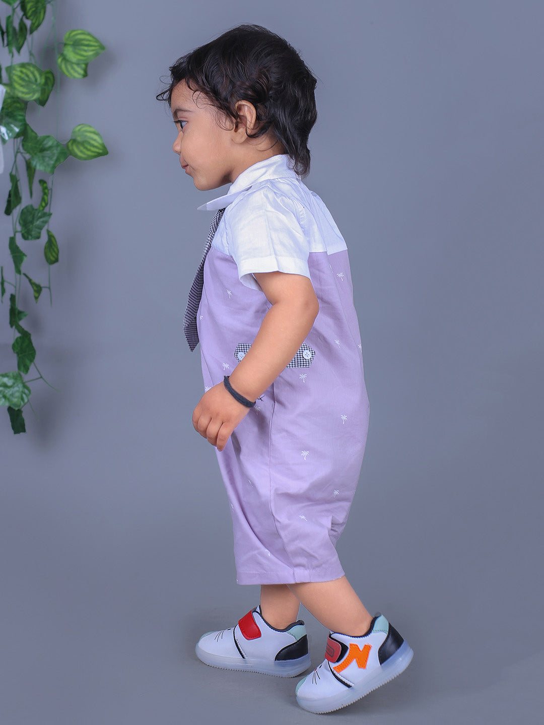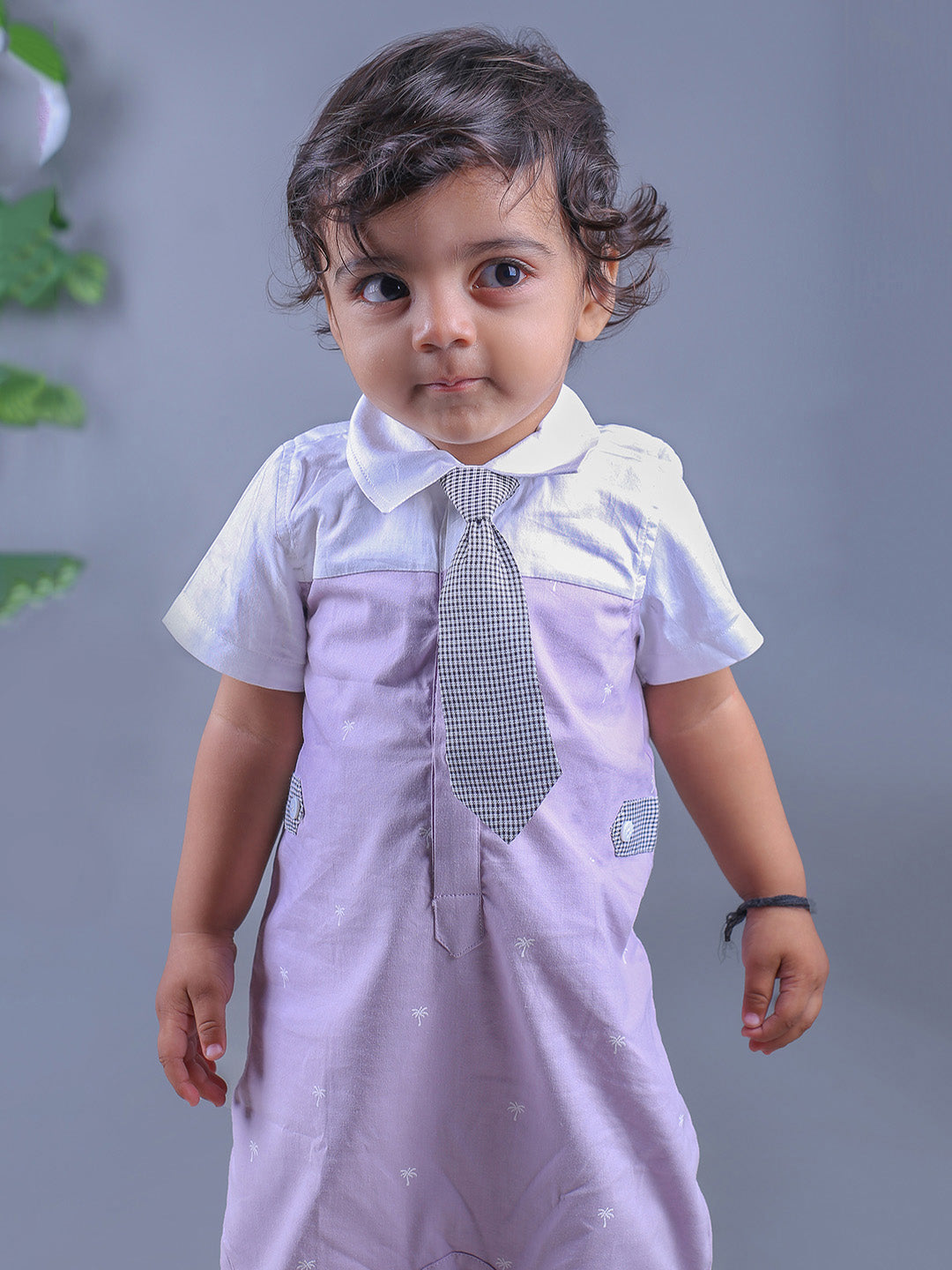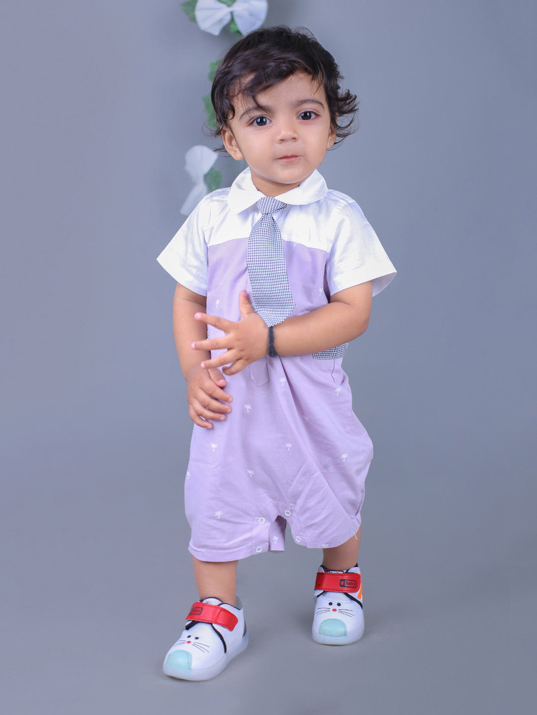 Dress your baby boy in style with our adorable pure cotton romper. This charming outfit features an all-over print and a contrast fabric yoke, combining comfort with a touch of elegance. Perfect for any occasion, this romper is designed with thoughtful details that make it both practical and stylish.