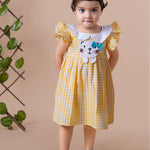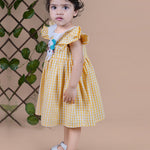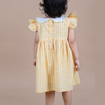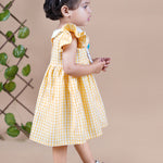 - Yellow and white yarn dyed gingham checks cotton dress with a soft cotton lining and gathers at the chest