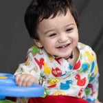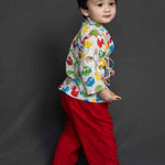 - Bottoms in contrast red cotton fabric with an elasticated waistband