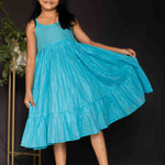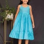 This charming ethnic set is designed for versatility and style, perfect for festive occasions or casual wear. The inner dress, crafted from soft blue cotton fabric with metallic stripes, features delicate straps and a frill at the base, offering a playful and elegant look. The contrasting yellow overcoat, made from breathable cotton, comes with 3/4th sleeves, tie-up details at the neck, and contrast white lace adorning the sleeve edges and bottom hem for a touch of sophistication. Wear the pieces together for a traditional look or style the inner frock separately for a casual outing—this set is as versatile as it is beautiful.