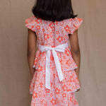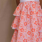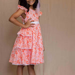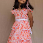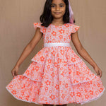 This adorable cotton frock features a charming orange floral print and comes with a soft cotton lining for added comfort. The dress is designed with tapered frill sleeves and a contrasting white belt that adds a stylish touch. The highlight of this frock is the 3 layered frills on each side, beautifully accented with contrasting white lace, giving it a delightful and elegant look.