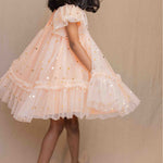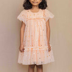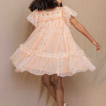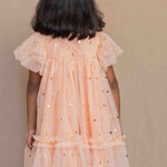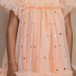 Get your little one party-ready with this stunning flared frock! Crafted in delicate mesh fabric, it features charming gold foil printed hearts all over, adding a festive sparkle to the look. With a crepe lining for comfort, the frock has an elegant empire waistline and heavily gathered puff sleeves. A back opening ensures easy dressing, while the thin frill detailing on the yokeline and near the bottom hem add extra flair.