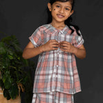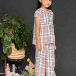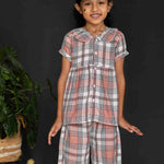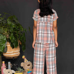 Soft, cozy, and stylish, this flannel nightwear set is perfect for a comfortable night's sleep. The top showcases a charming gathered front panel, a delicate Peter Pan collar, and short sleeves, blending timeless elegance with everyday wearability. Paired with matching pants featuring a fully elasticated waistband for a secure and snug fit, this set ensures maximum comfort. The addition of white piping and shell buttons adds a touch of sophistication to the playful peach and white checkered pattern. A delightful combination of cuteness and practicality, ideal for sweet dreams.