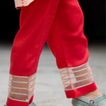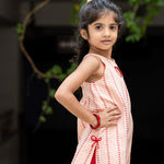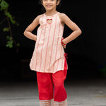 Elevate your little girl's festive wardrobe with this Peach Hearts Jacquard Kurta and Red Pants set. The blend of traditional charm and modern design makes it a perfect choice for special occasions.