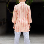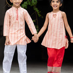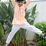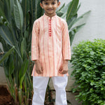 Dress your little boy in elegance with this Peach Hearts Jacquard Kurta and Straight Pants set. Perfect for festive occasions and special events, this outfit combines traditional design with contemporary style.