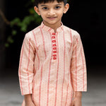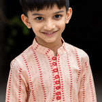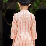Dress your little boy in elegance with this Peach Hearts Jacquard Kurta. Crafted from soft jacquard cotton with subtle heart weaves and lurex shimmer stripes, this kurta combines traditional charm with a touch of contemporary flair. The contrast red loops along the front placket and mandarin collar add a stylish accent, while the relaxed fit ensures all-day comfort. Pair it with any matching pants.