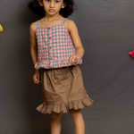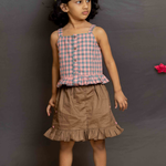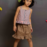 Pink checks top and brown skirt