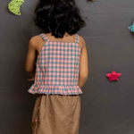 Peplum top with shoulder straps and full front buttons in pink checks.