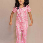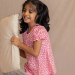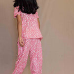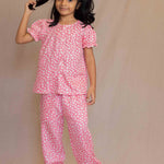 This charming pink nightsuit for girls features an all-over flower print, perfect for adding a touch of fun to bedtime. The top comes with a gathered front panel and puff sleeves, giving it an adorable, playful look. The elasticated pants offer a comfortable fit and are finished with a cute frill at the bottom hem. Made for cozy nights, this set combines comfort with cute design elements, making it a bedtime favorite.