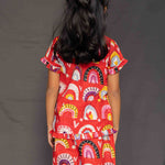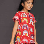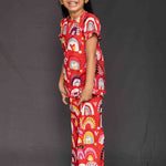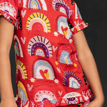 Add a pop of color to bedtime with this cheerful bright red pajama set, featuring an all-over rainbow print that’s sure to delight. The short-sleeve top is adorned with self-fabric frills on the sleeves and base hemline, adding a playful touch. Paired with full-length pants featuring an elasticated waistband and handy pockets, this set combines style with practicality. Contrast white piping on the sleeve edges and pant hems enhances the look, while the soft, breathable cotton fabric ensures maximum comfort for a cozy night’s sleep.