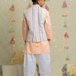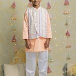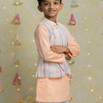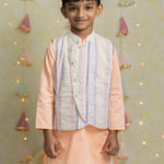 Introduce your little one to traditional elegance with the Stripes Mirror Bandhgala, Peach Kurta, and Straight Pants Set. This ensemble blends timeless charm with contemporary detailing, perfect for festive occasions.