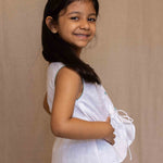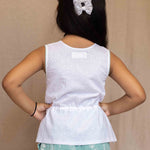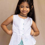 his adorable white dobby peplum top is crafted from pure cotton with a soft cotton lining, offering both comfort and style. Contrast piping on the armholes and a cute drawstring add charming details, while the contrast fabric buttons with loop closure create a perfect match for any printed pants. A versatile and stylish choice for a range of looks!
