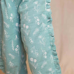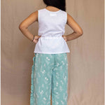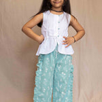 This adorable top and pants combo for girls is crafted from pure cotton, perfect for comfort and style. The white dobby peplum top features a cotton lining, contrast piping on the armholes, and a cute drawstring for a snug fit. It’s finished with contrast fabric buttons and a loop closure, matching the stylish printed pants. The full-length elasticated pants, made from soft cotton double cloth, are adorned with a delicate frill along both side seams and have a chic angular curved hem.