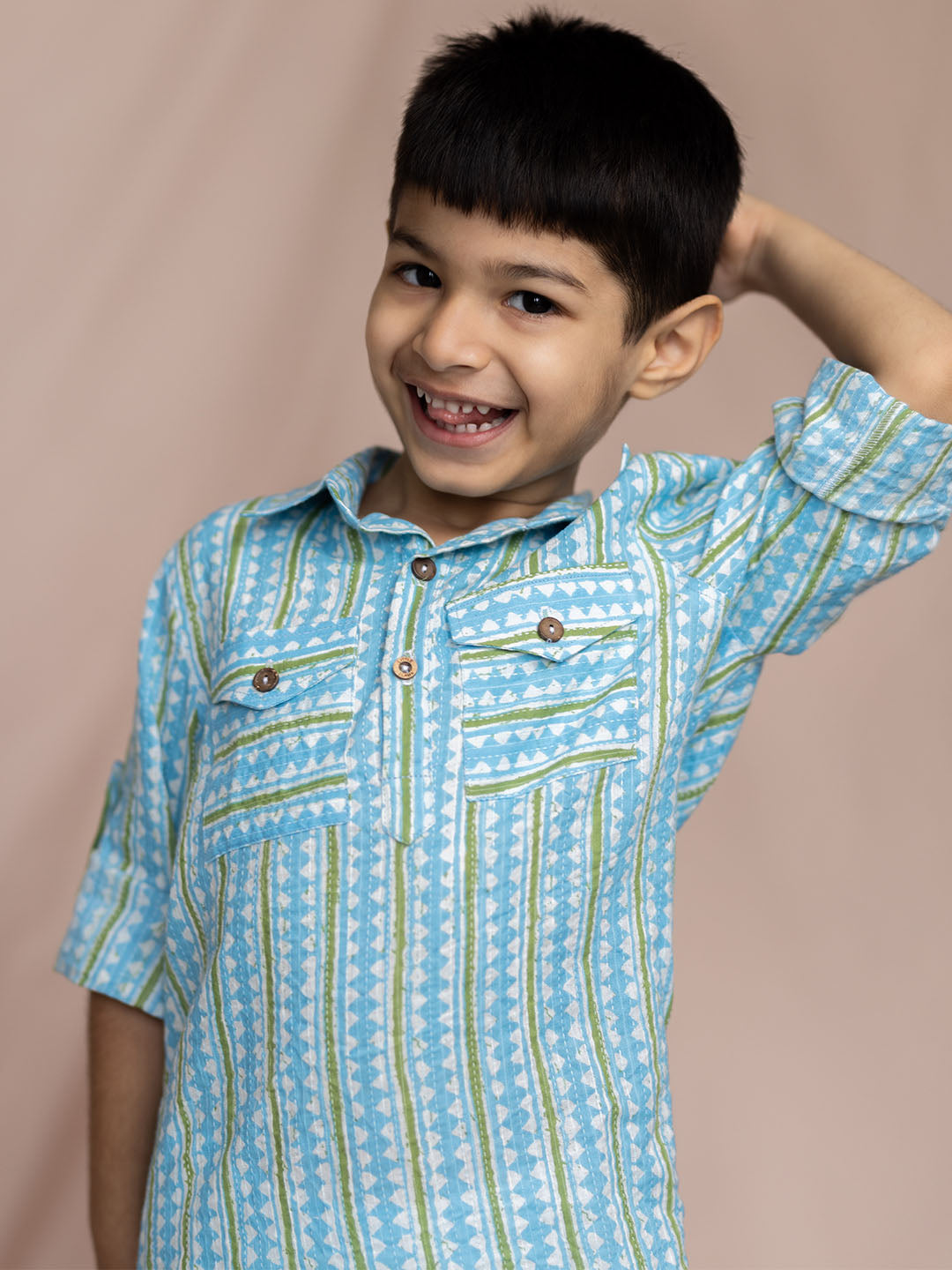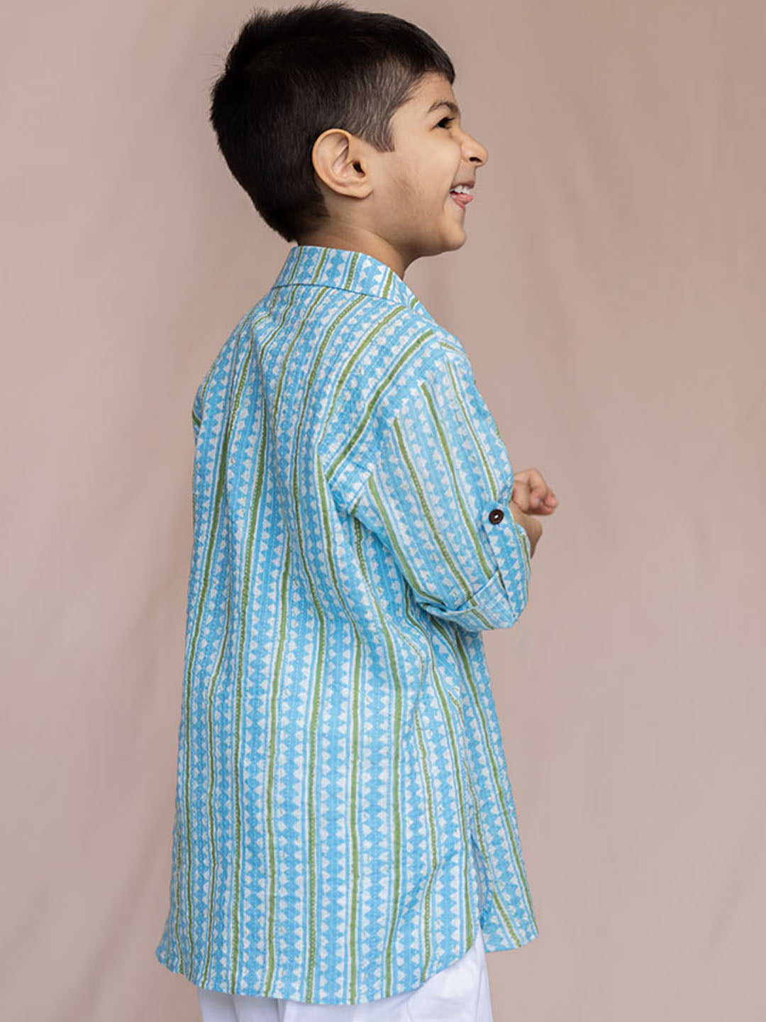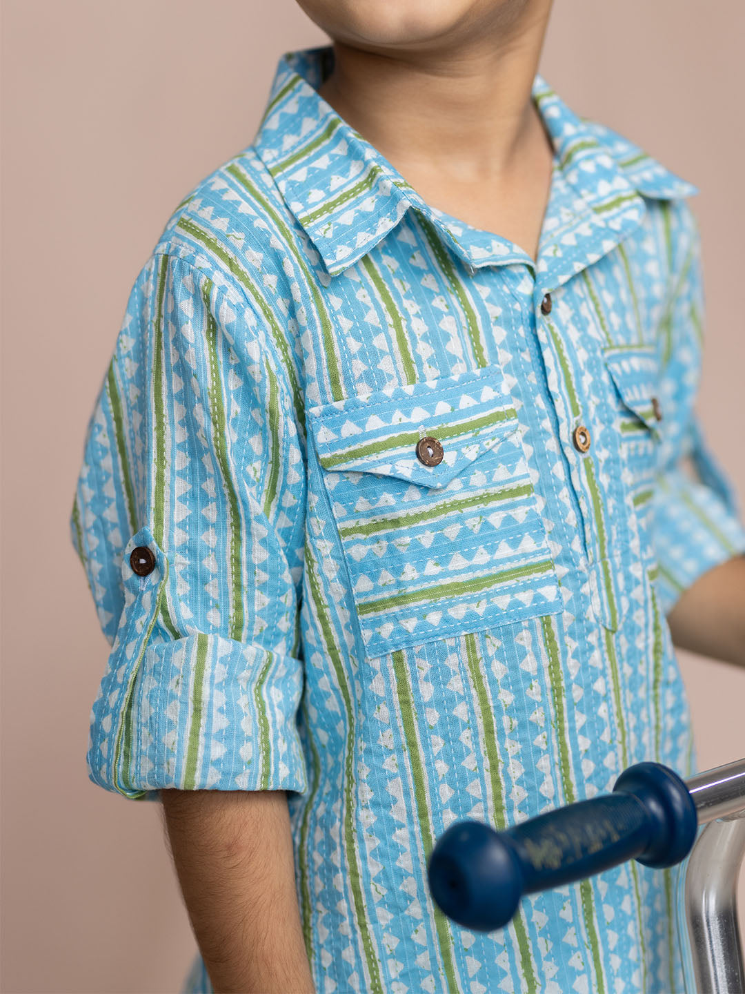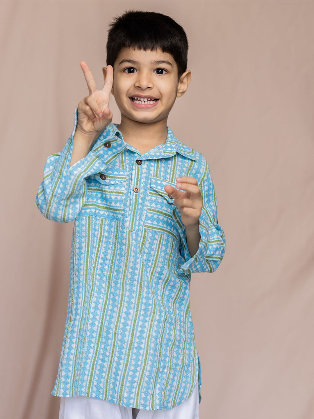Pair it with any matching set of pants, this Sky Blue Kantha Work Kurta is a blend of comfort and style. Made from soft printed cotton, the kurta features kantha work, a sharp pointed collar, and a curved hemline for a modern touch. Roll-up sleeves with loop and button fastening add versatility, while two front pockets with horizontal stripe details, flaps, and buttons add both charm and functionality.