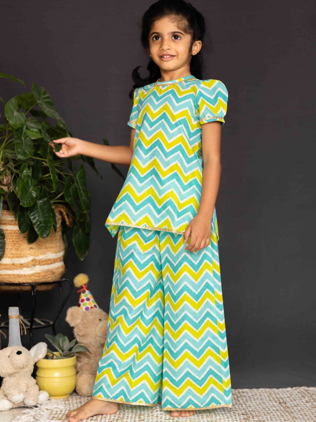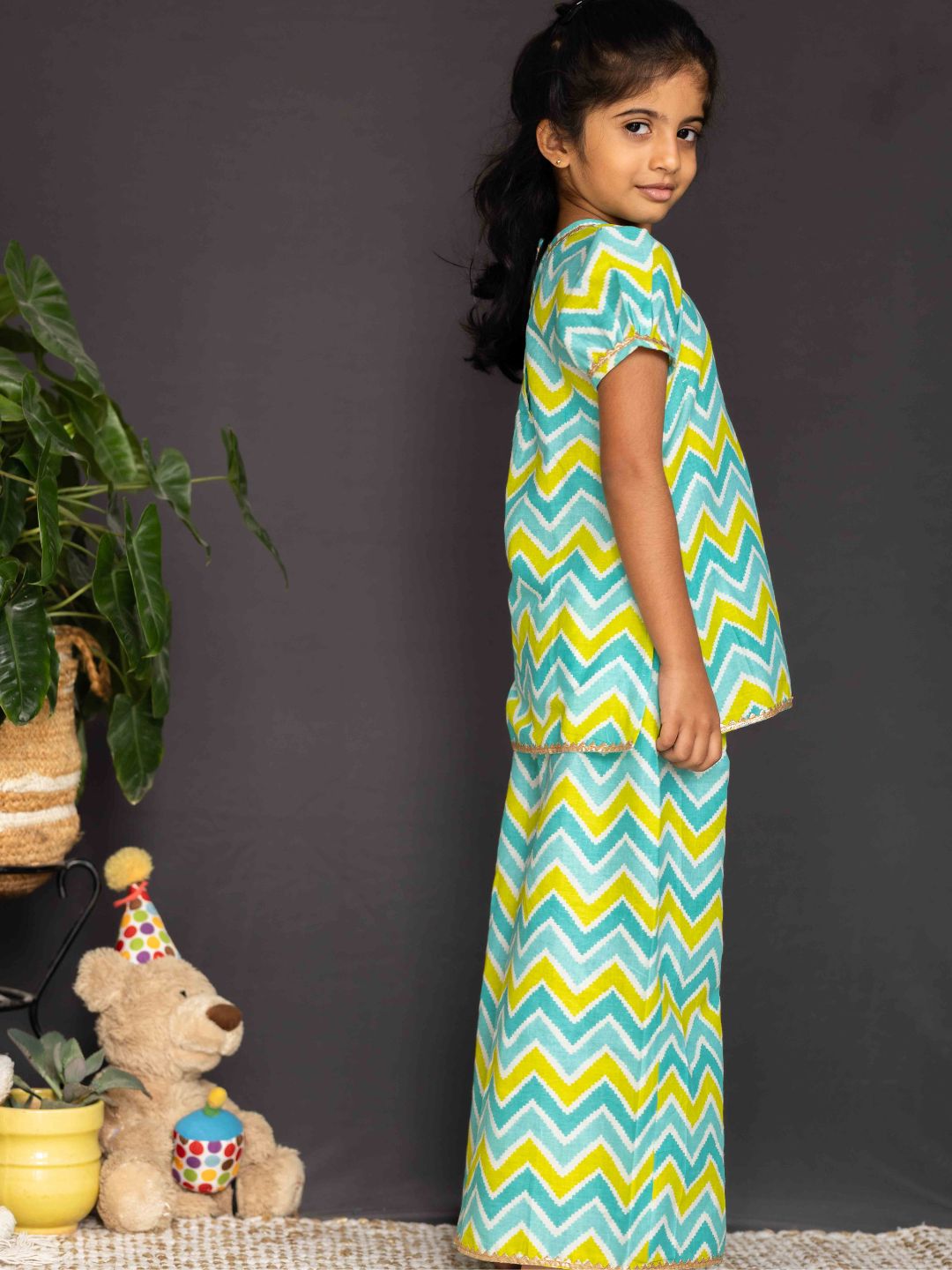 Elegant and vibrant, this girls' ethnic wear set is perfect for festive occasions. The short kurta features puff sleeves and a bright blue-green chevron print, accented with antique gold gota lace on the neckline, sleeve edges, and hemline for a sophisticated touch. Paired with flared pants that are fully elasticated for comfort and adorned with matching gota lace detailing at the hem, this set blends style with ease. Ideal for celebrations, it also comes with a matching twinning set for boys, making it perfect for coordinated family ensembles.