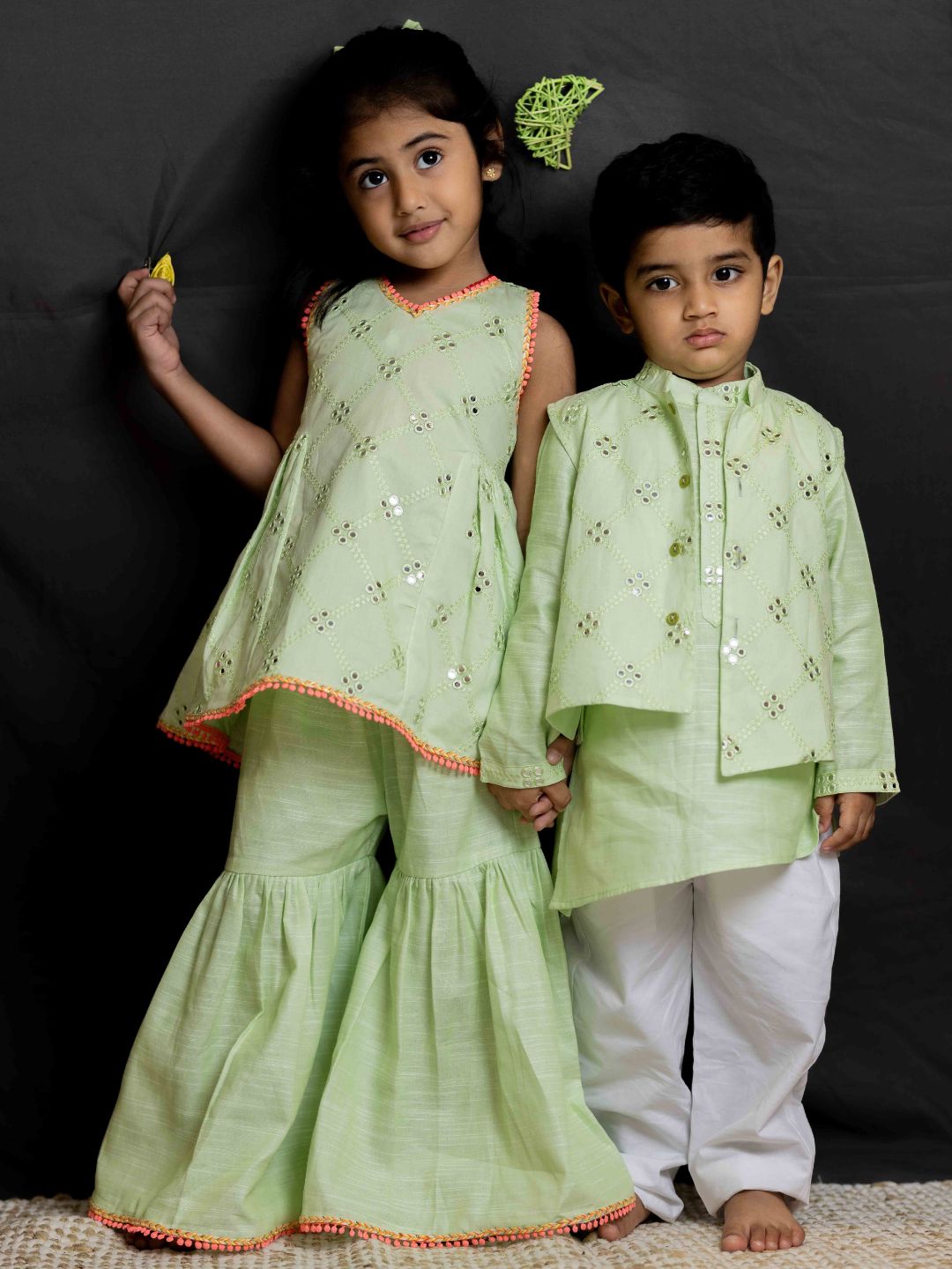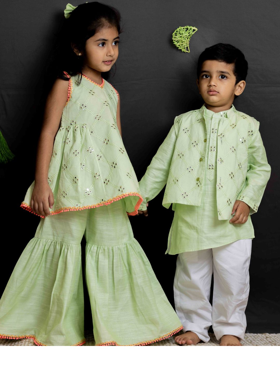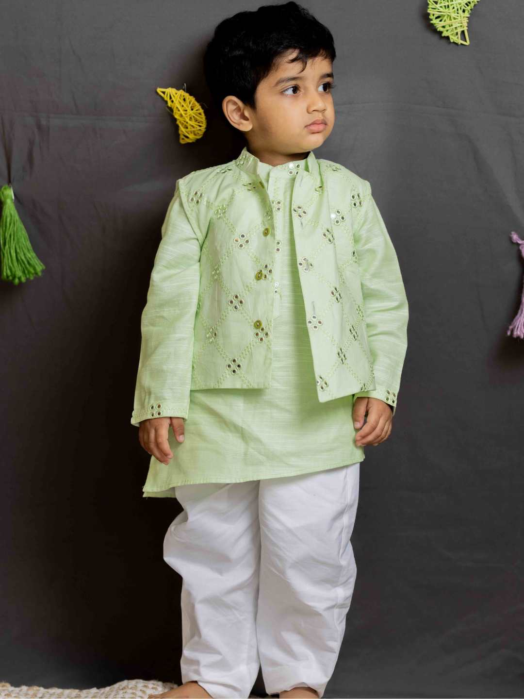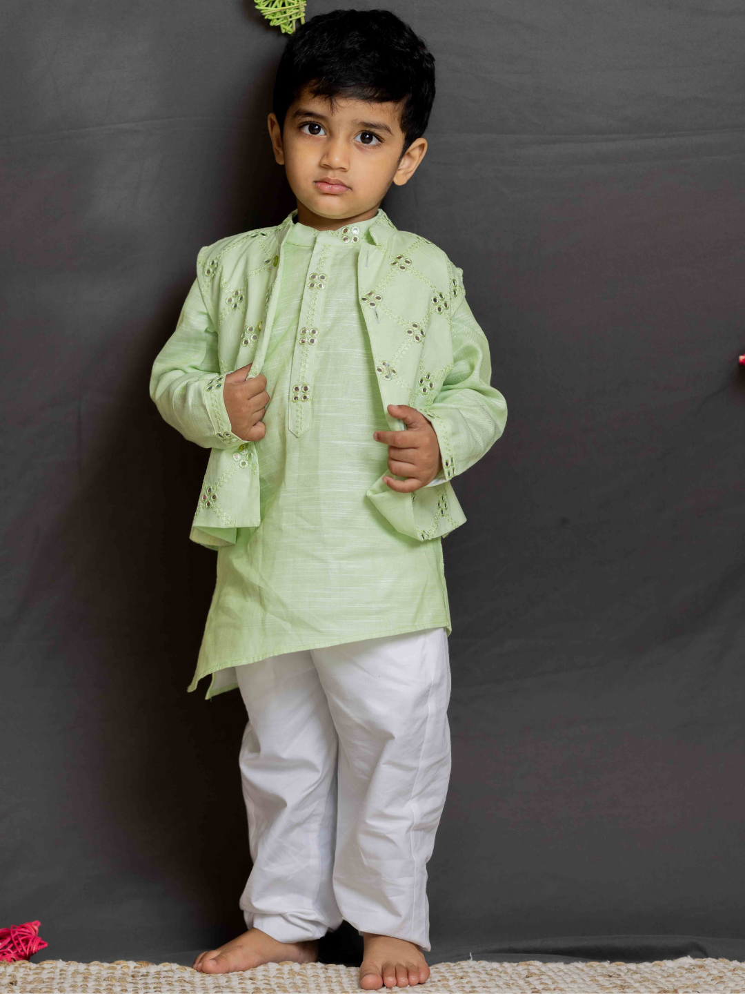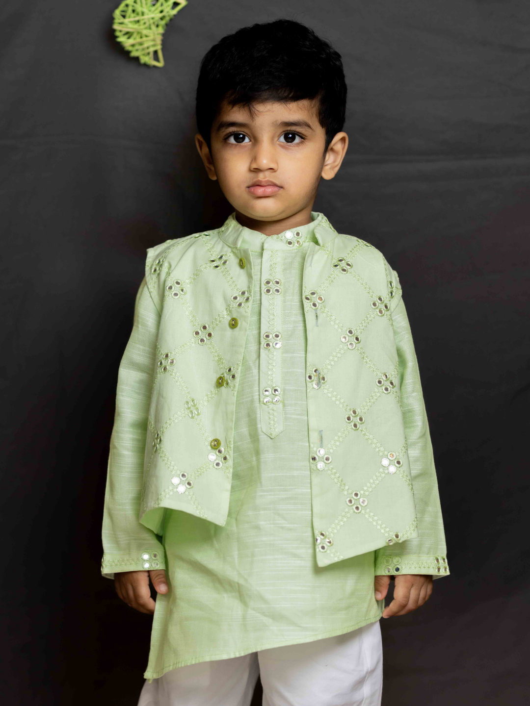 - Pastel Green Cotton Kurta with a mandarin collar, front opening, and an asymmetric hemline for a modern ethnic look.