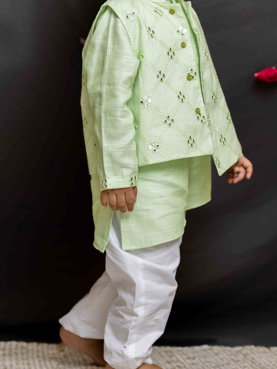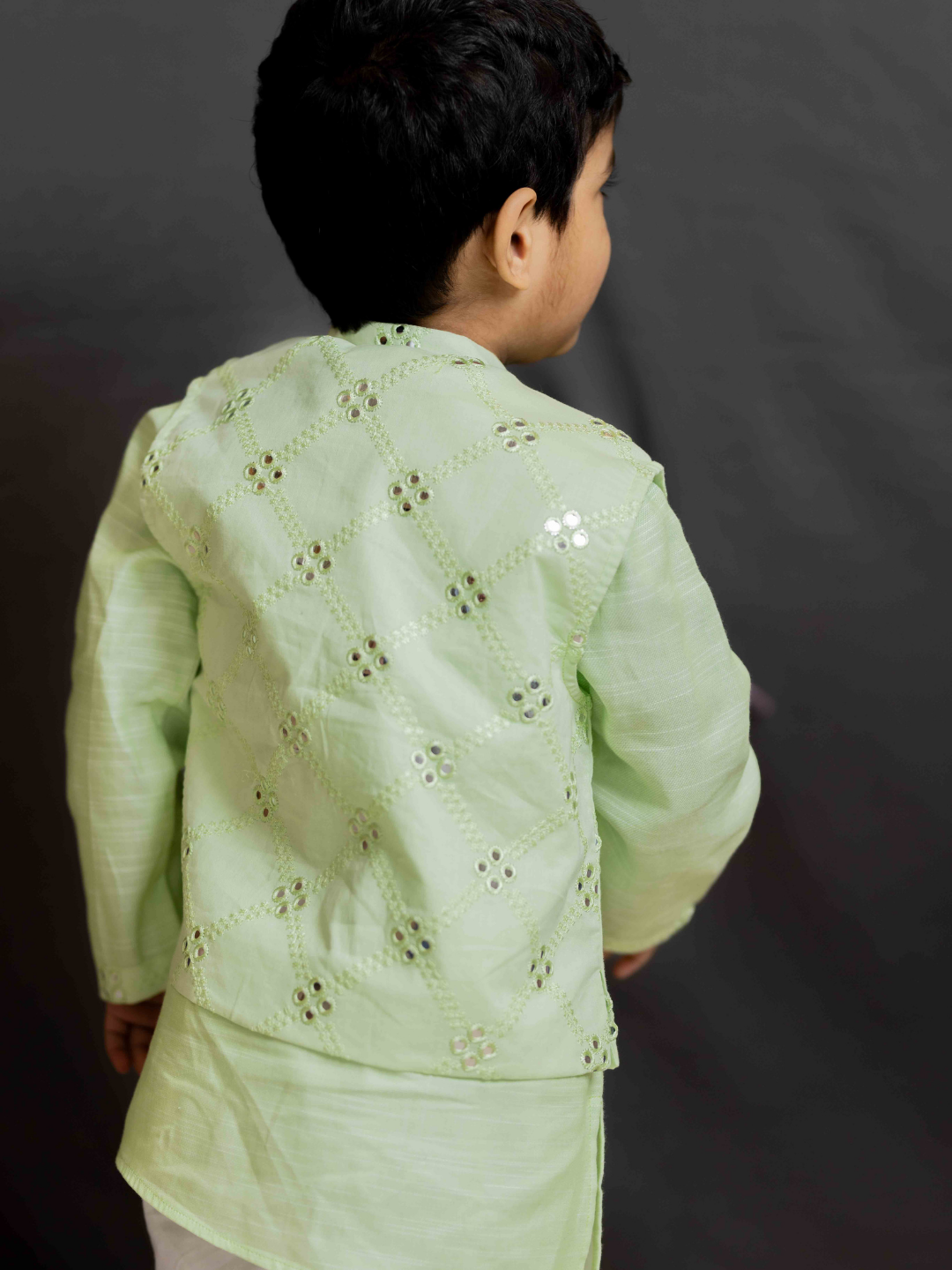 Mirror Work Bundi Jacket with cotton lining, mandarin collar, and an asymmetric hemline, adding festive flair and elegance.