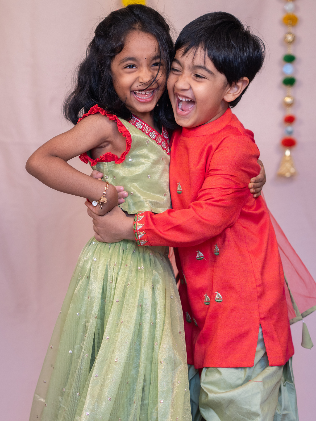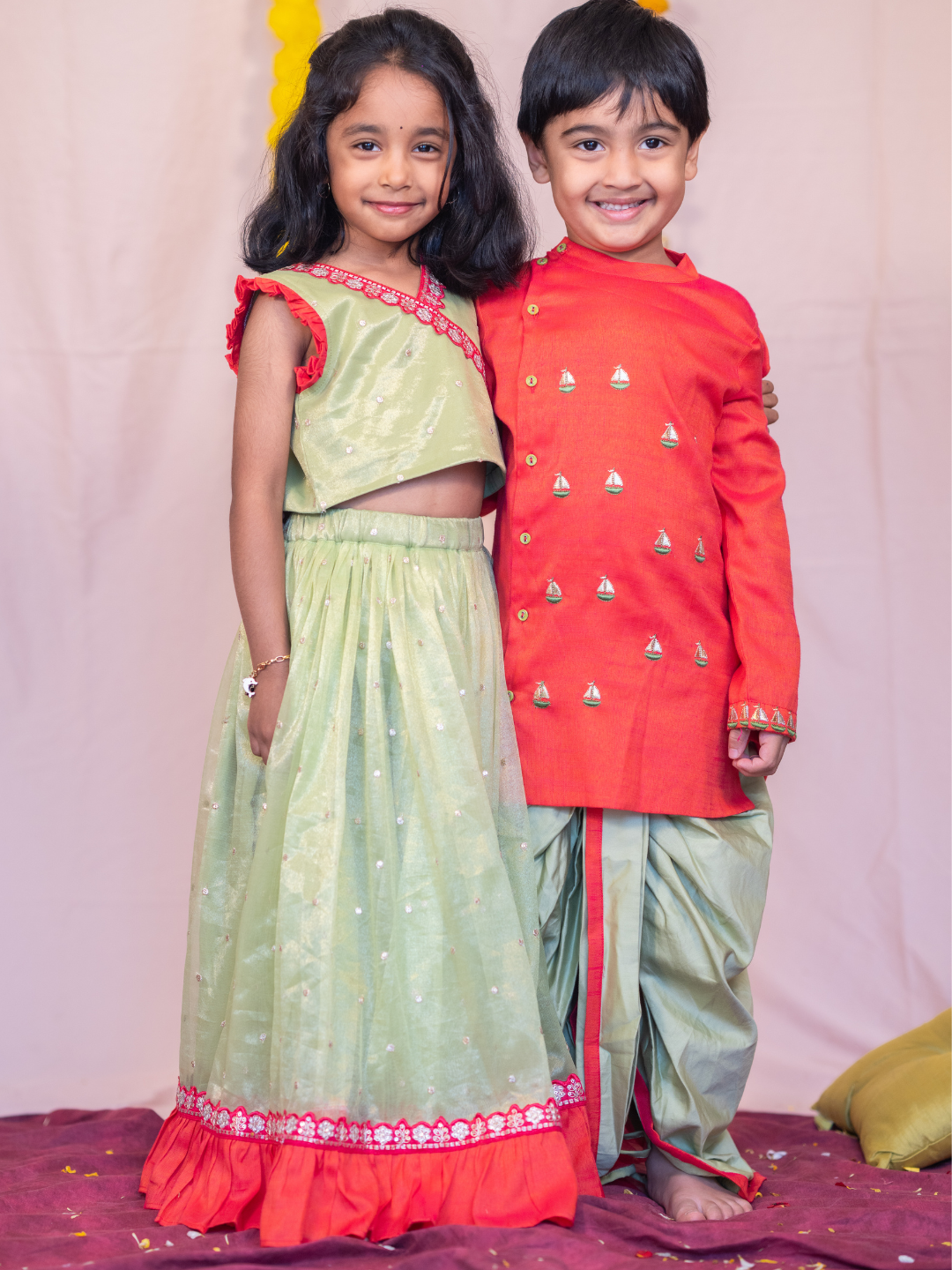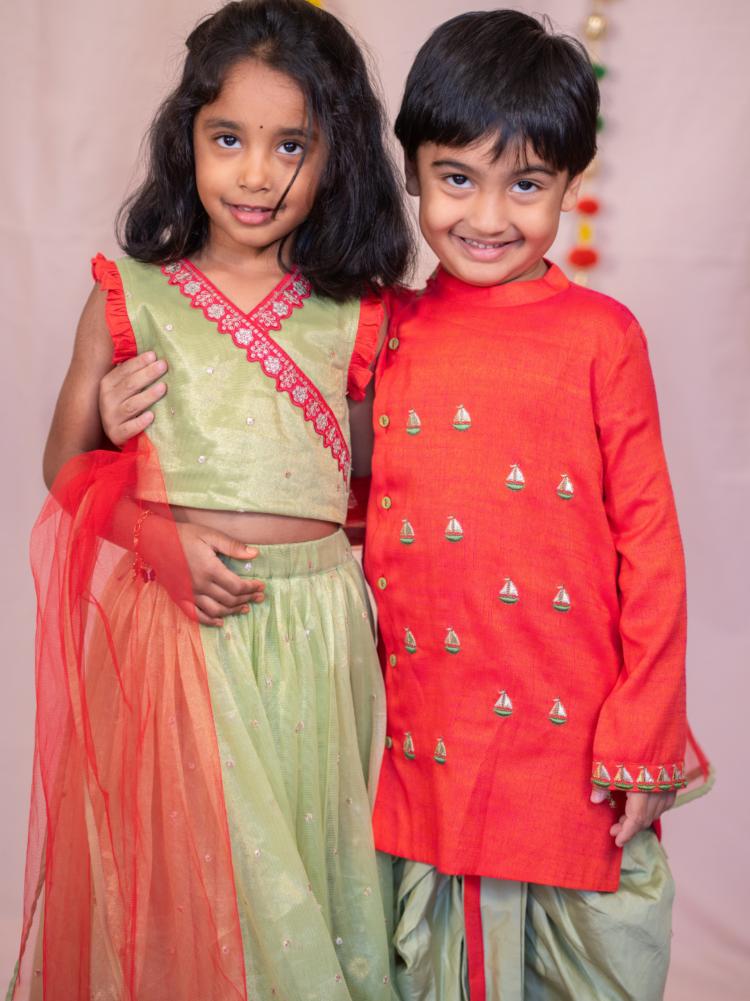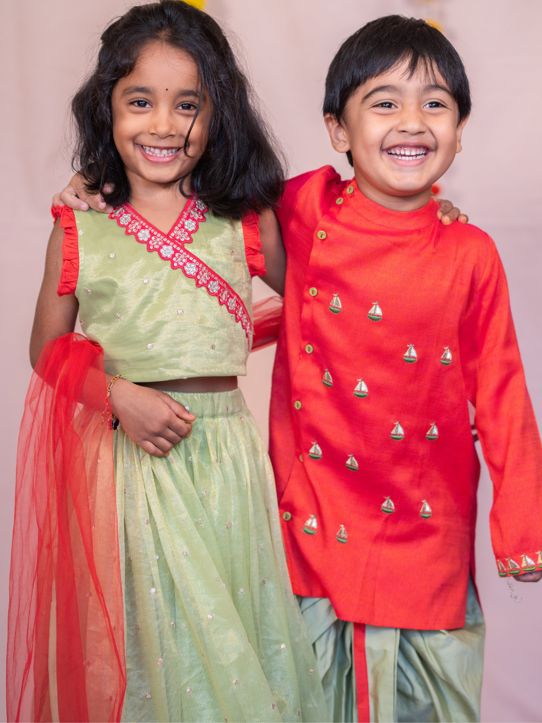Contrast Red Dupatta accented with matching green details, completing the coordinated look.