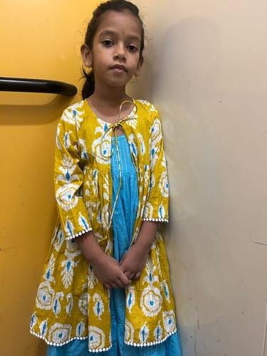This charming ethnic set is designed for versatility and style, perfect for festive occasions or casual wear. The inner dress, crafted from soft blue cotton fabric with metallic stripes, features delicate straps and a frill at the base, offering a playful and elegant look. The contrasting yellow overcoat, made from breathable cotton, comes with 3/4th sleeves, tie-up details at the neck, and contrast white lace adorning the sleeve edges and bottom hem for a touch of sophistication. Wear the pieces together for a traditional look or style the inner frock separately for a casual outing—this set is as versatile as it is beautiful.