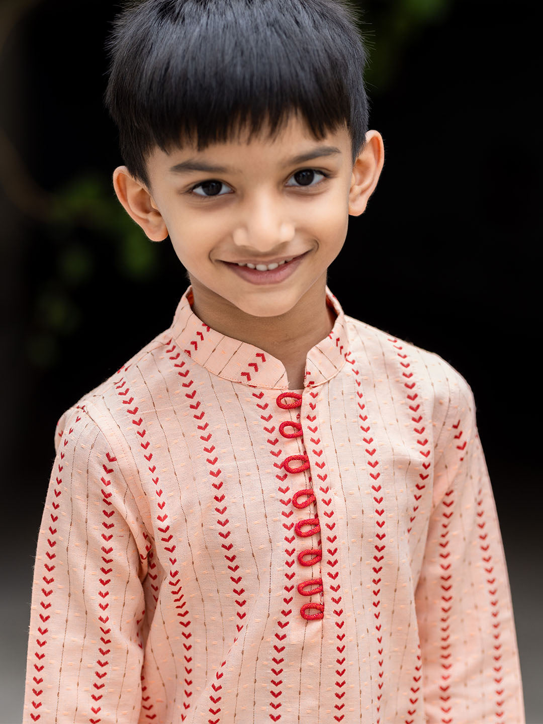 Dress your little boy in elegance with this Peach Hearts Jacquard Kurta. Crafted from soft jacquard cotton with subtle heart weaves and lurex shimmer stripes, this kurta combines traditional charm with a touch of contemporary flair. The contrast red loops along the front placket and mandarin collar add a stylish accent, while the relaxed fit ensures all-day comfort. Pair it with any matching pants.