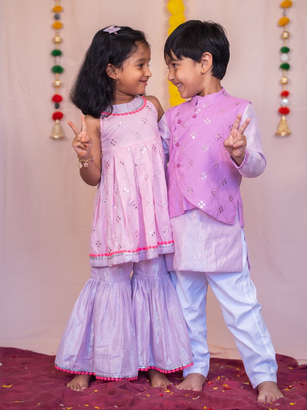 Pre-order Indian Wear: Pastel pink mirror embroidered kurta and sharara set in soft, breathable cotton fabric.