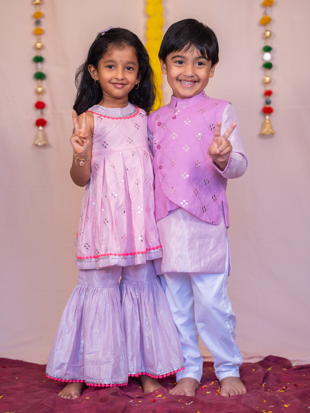 Stylish Sharara Pants: Elasticated waist sharara in lilac shimmer fabric, fully lined with cotton and finished with contrast lace accents.