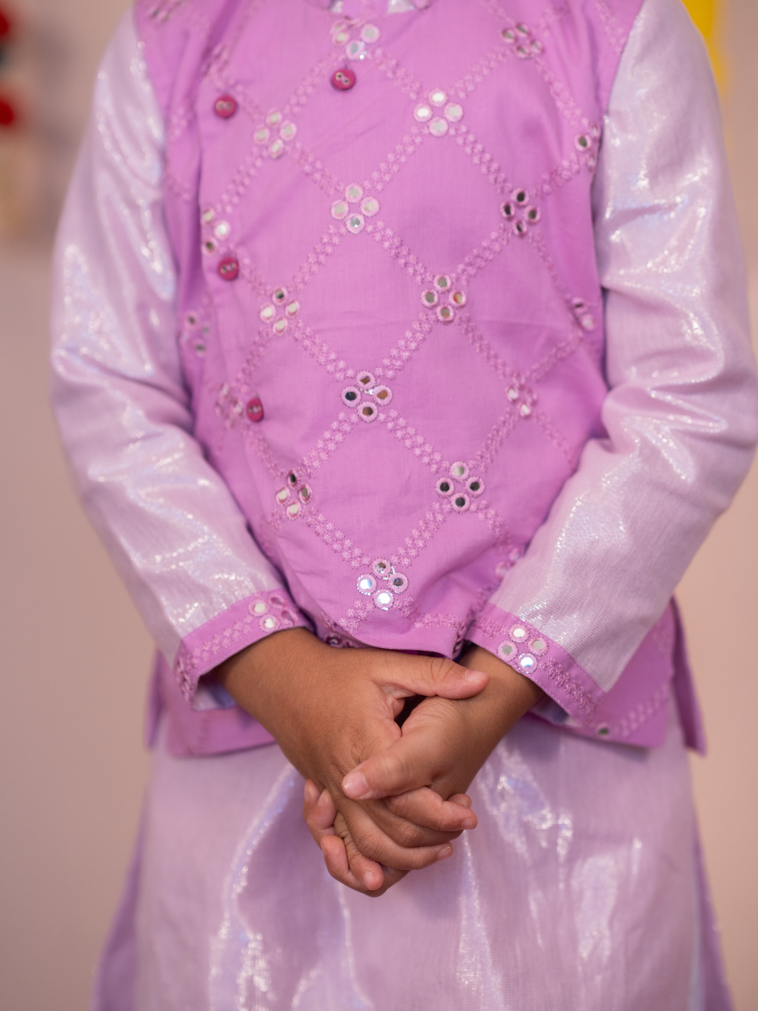 Shimmer Cotton Kurta: Features a mandarin collar, front opening, cotton lining, and mirror fabric patches on sleeves, collar, and placket—stylish enough to wear without the jacket.