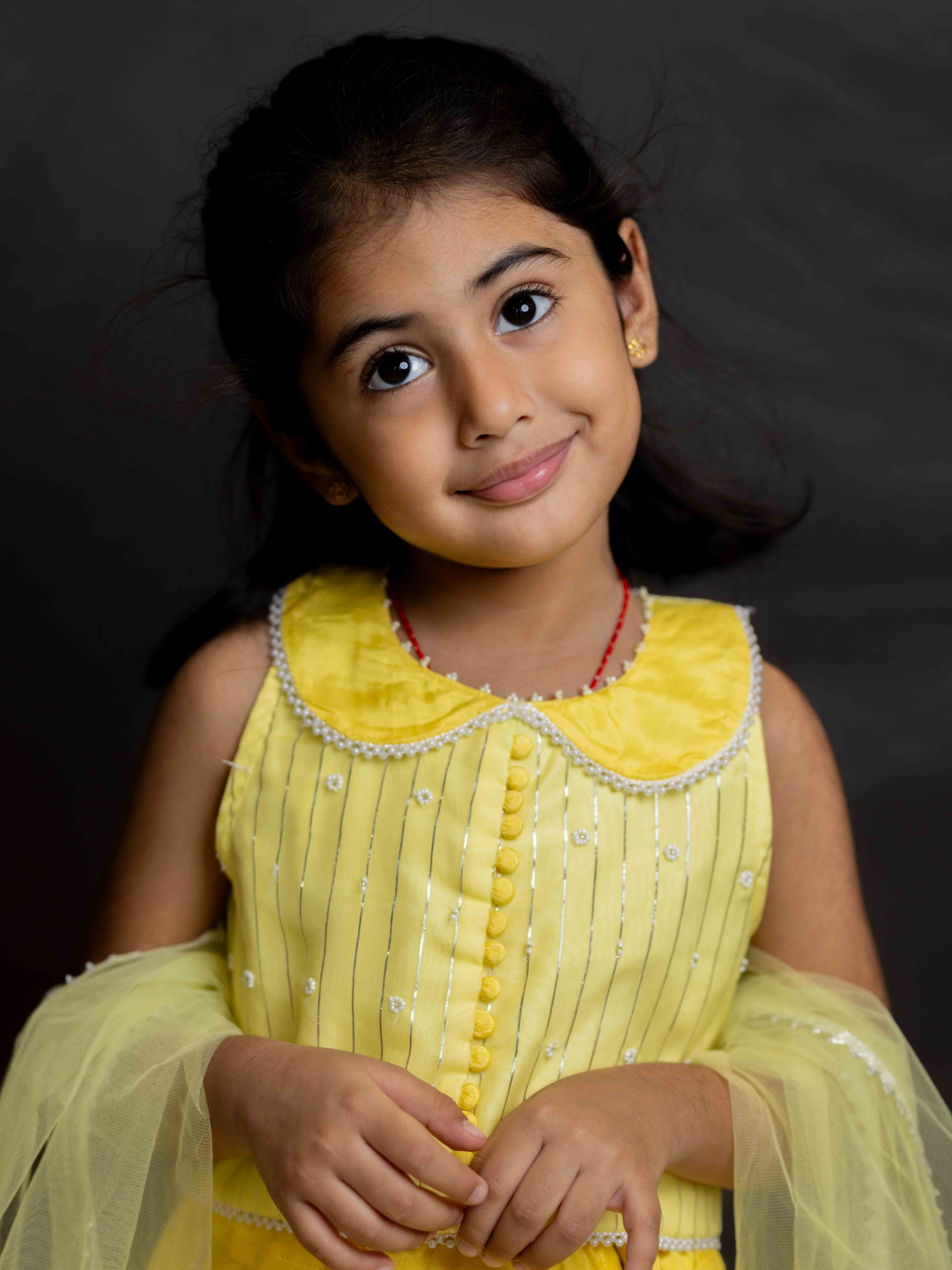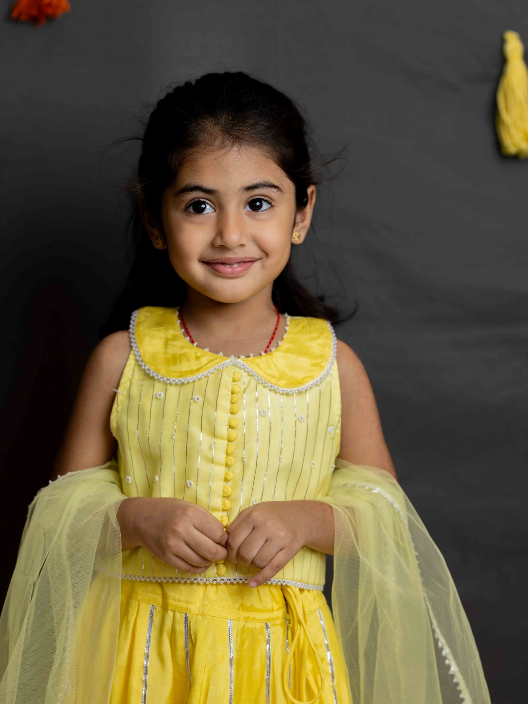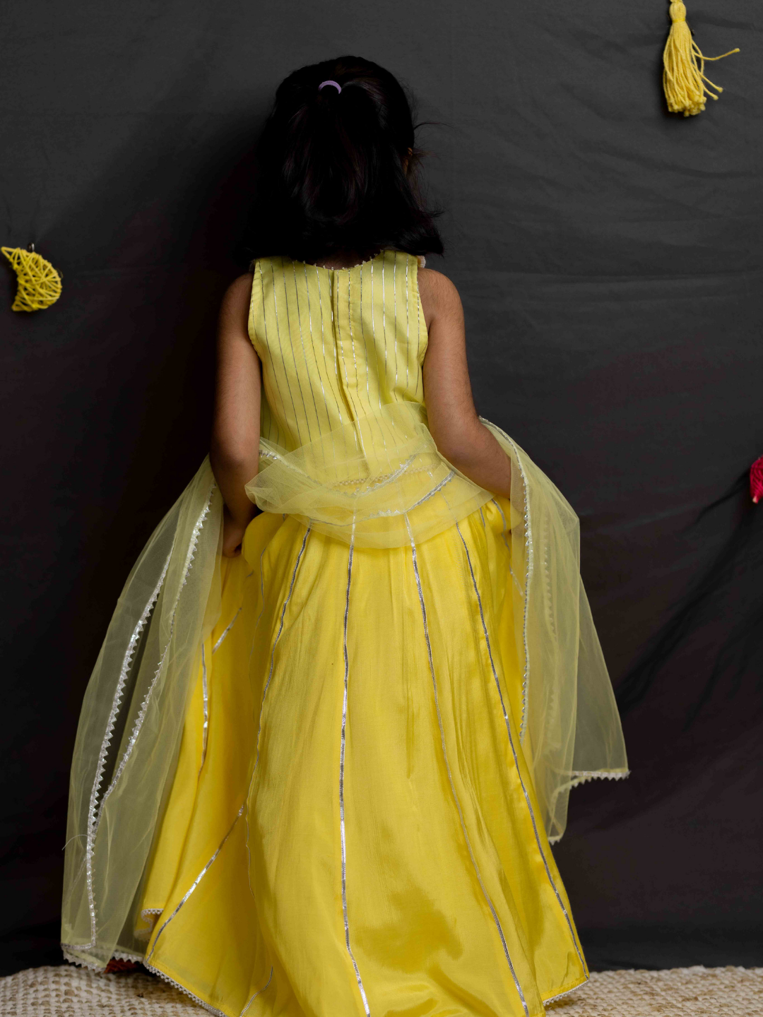 Yellow Net Dupatta adorned with silver gota lace to complete the coordinated festive look.