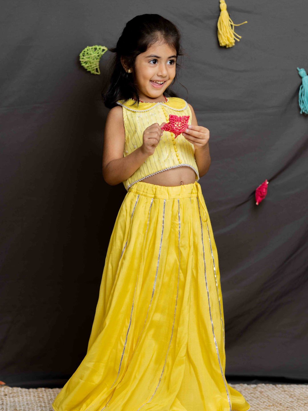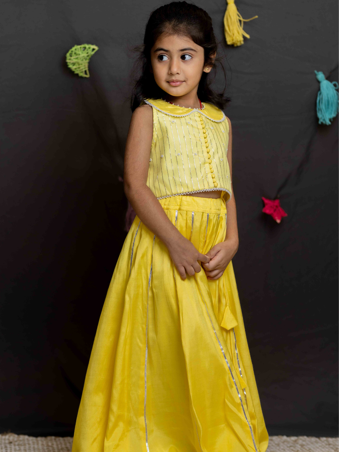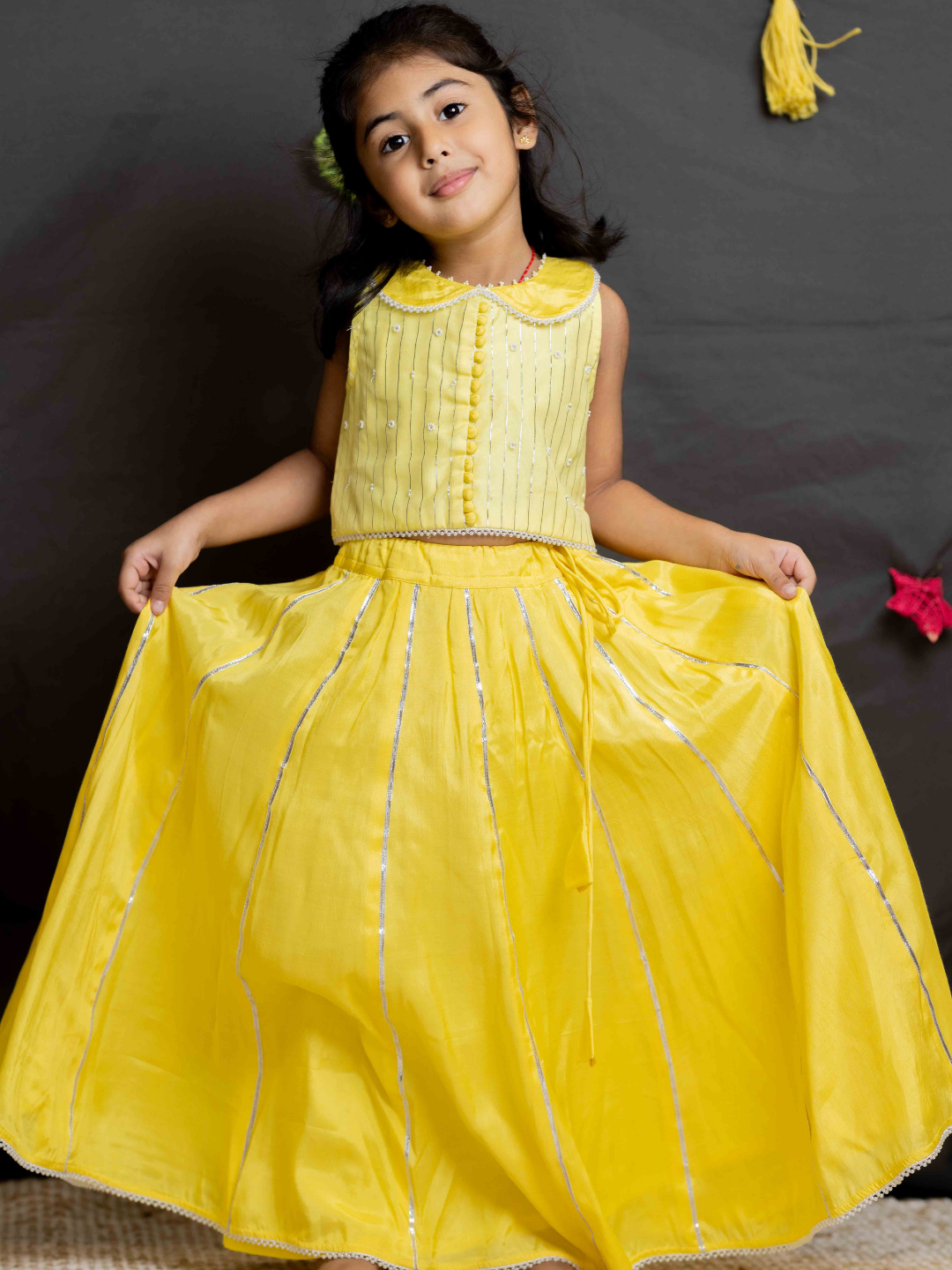 Yellow Lehenga in cotton santoon and organza with cotton lining, featuring a drawstring waist, kalis, silver gota detailing, and pearl work lace at the hem.