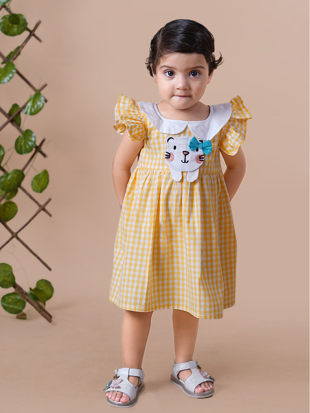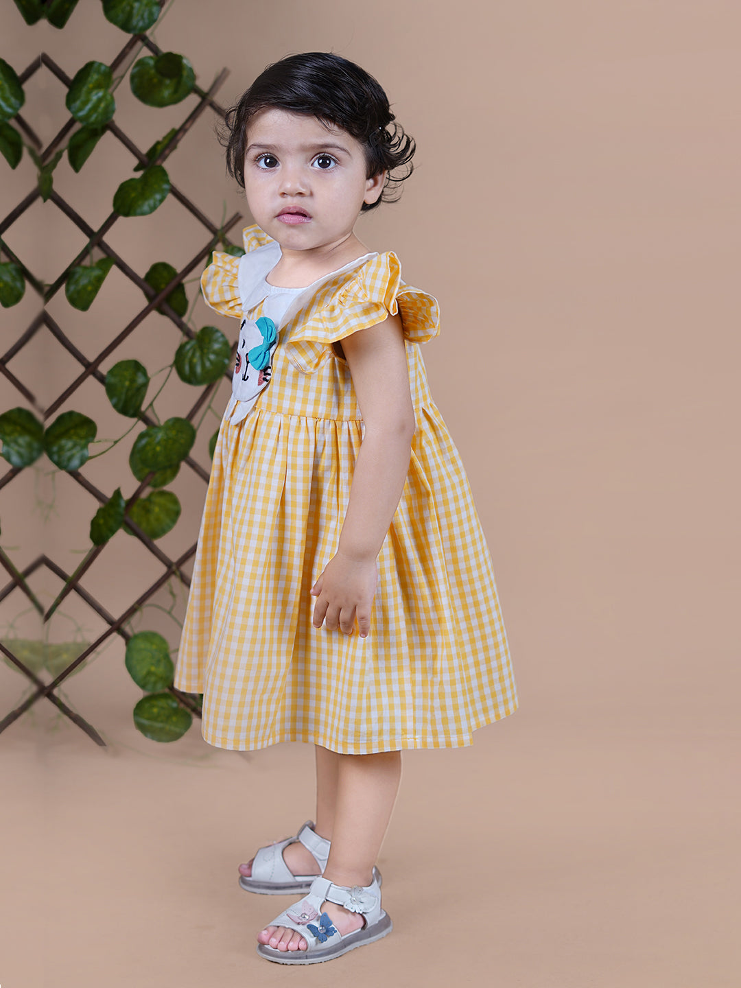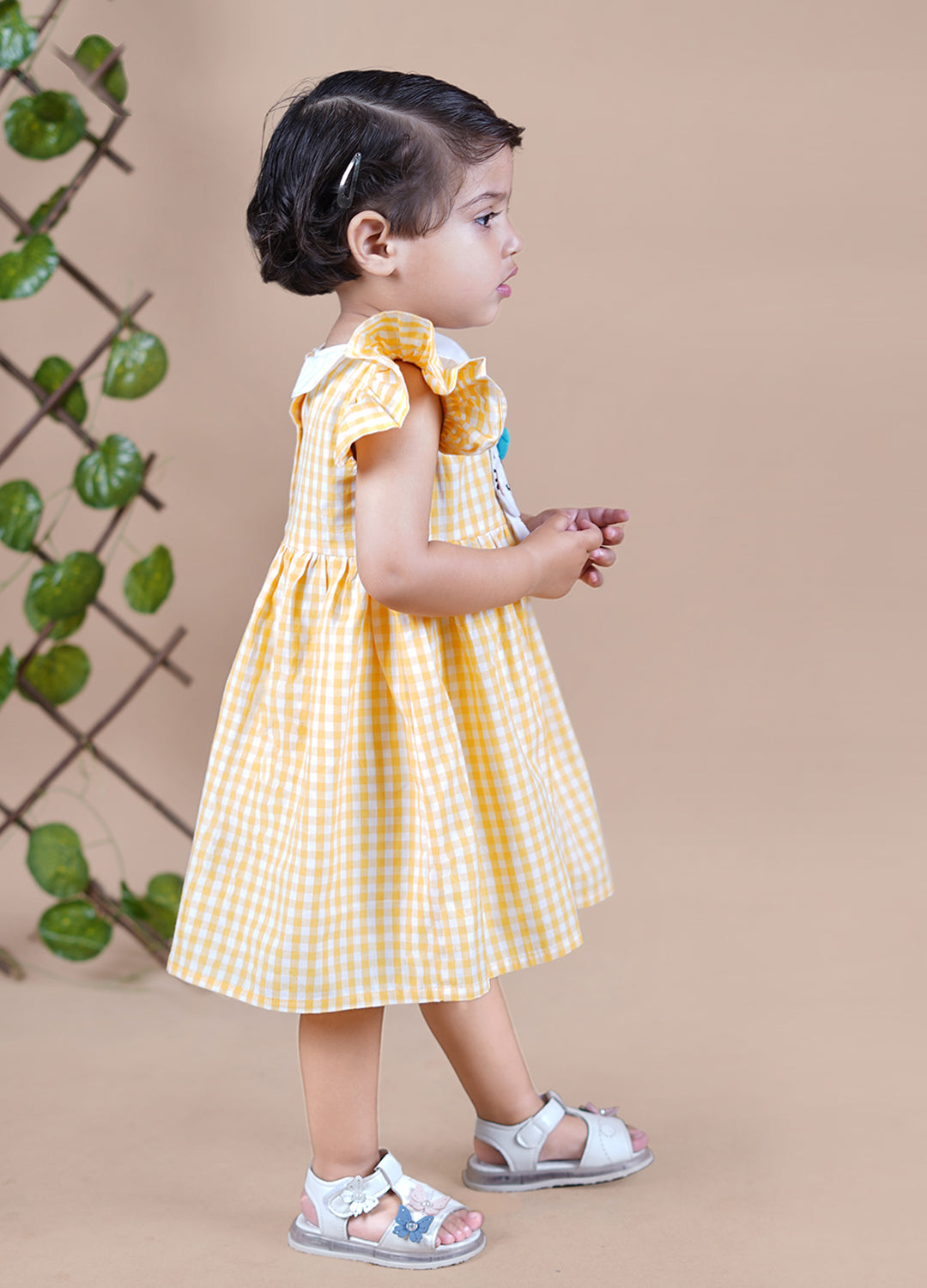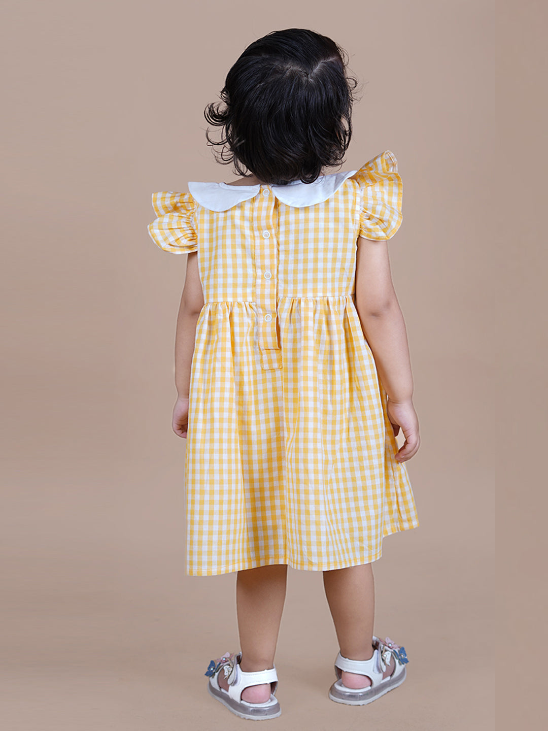 - Yellow and white yarn dyed gingham checks cotton dress with a soft cotton lining and gathers at the chest