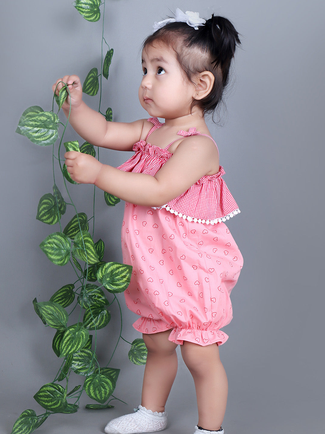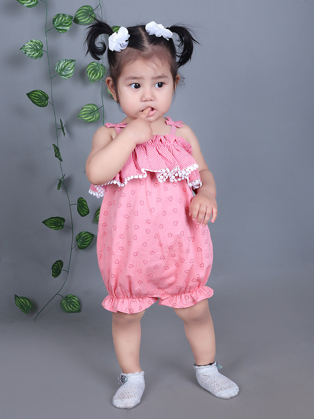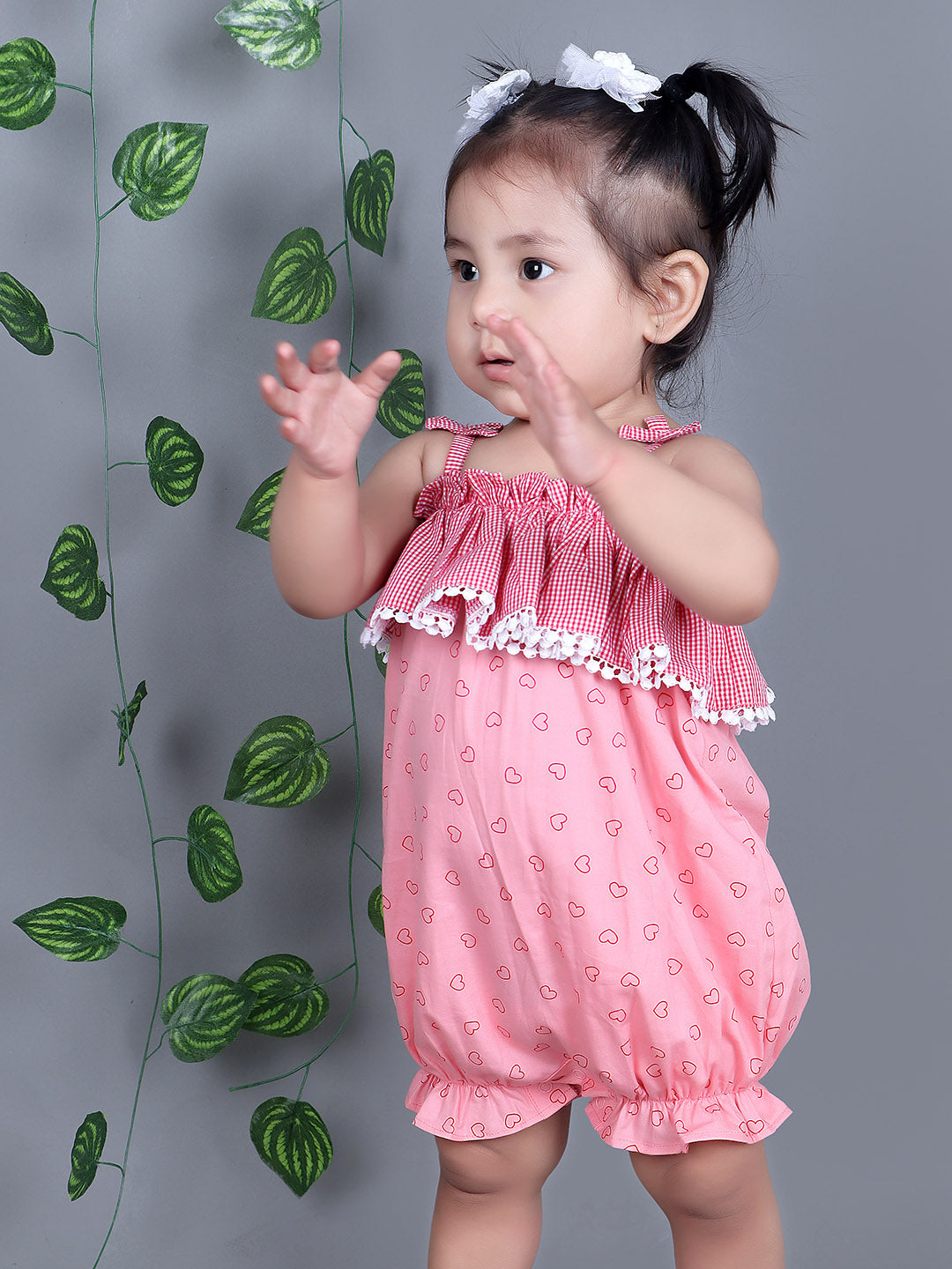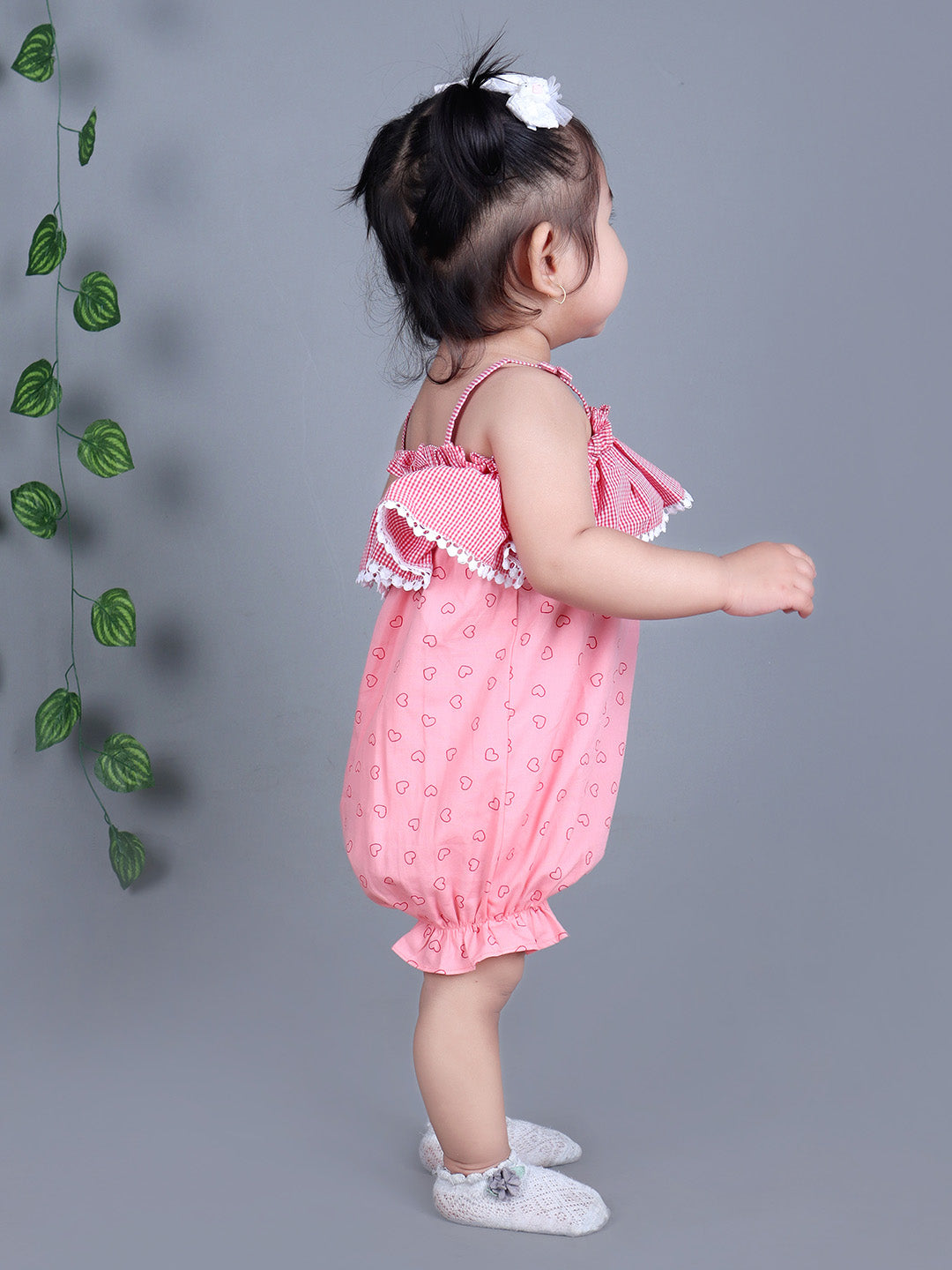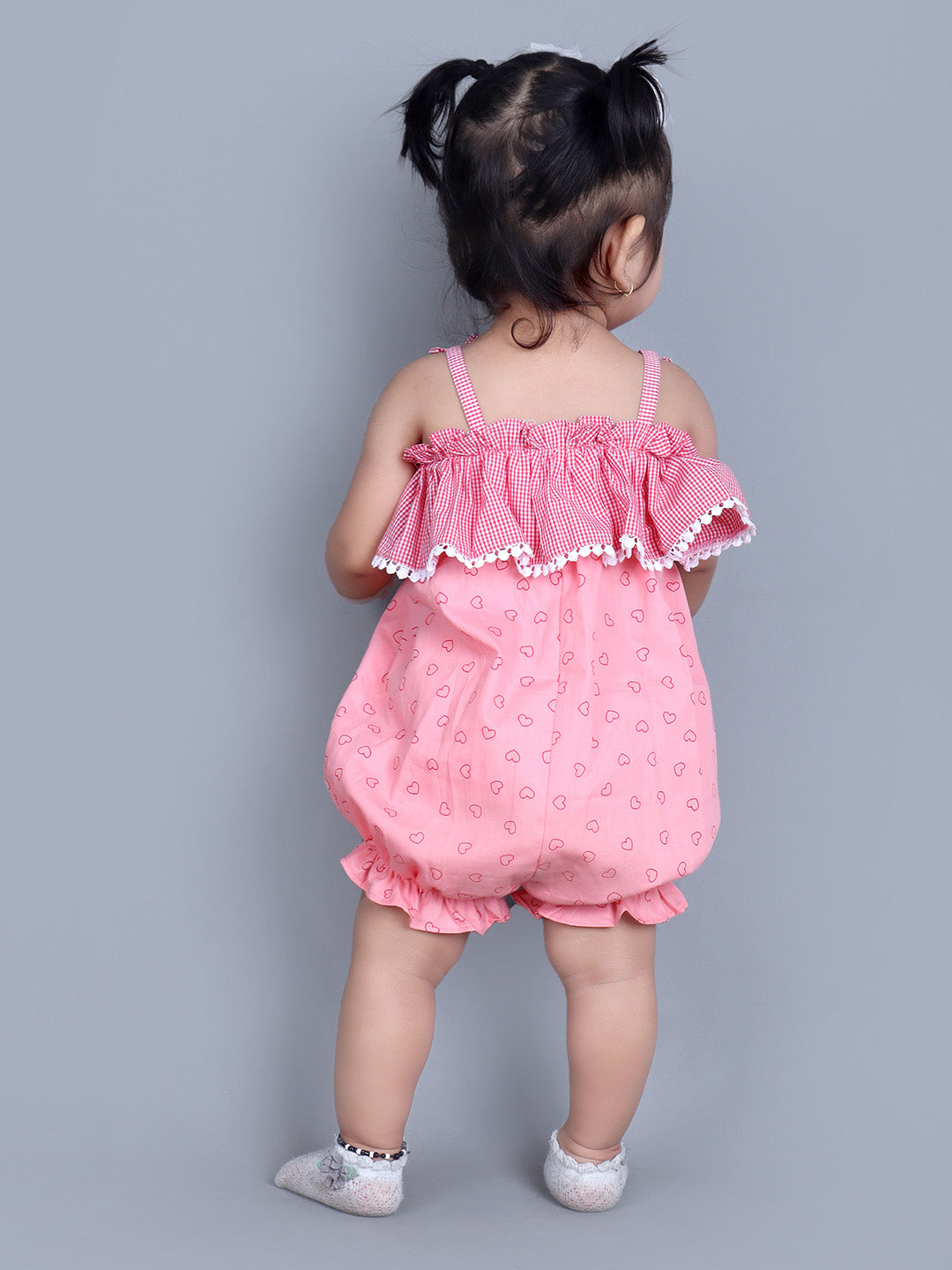 Adorable Heart Print: This romper is adorned with an all-over heart print in a soft pink color, perfect for sunny days and cheerful outings.