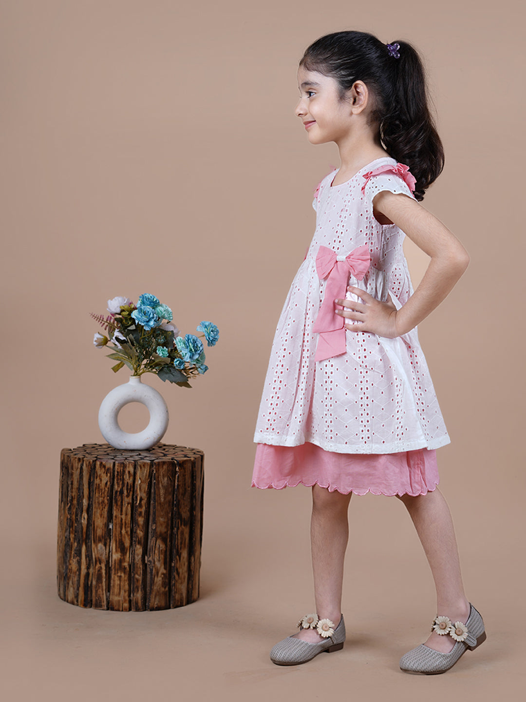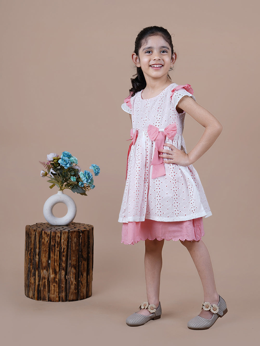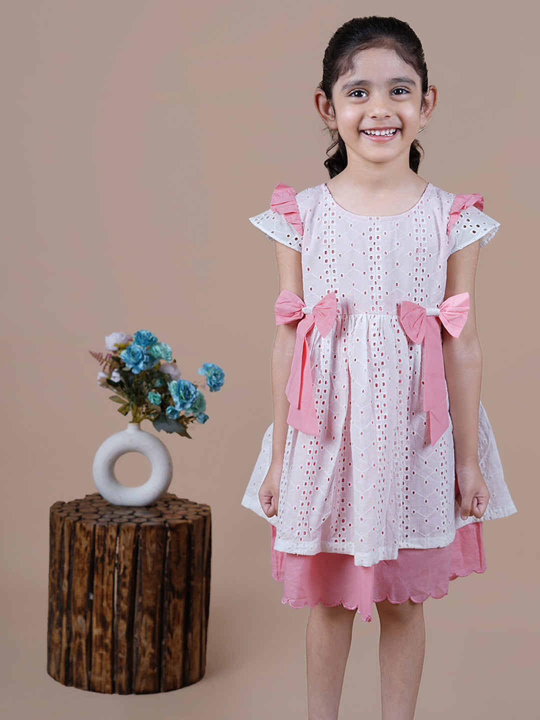 Knee Length White Schiffli Girls frock with 2 bows