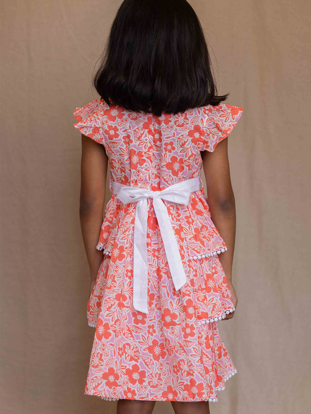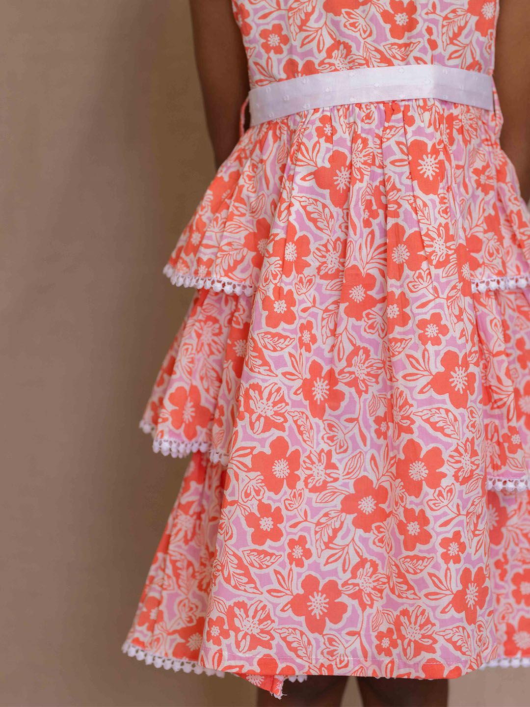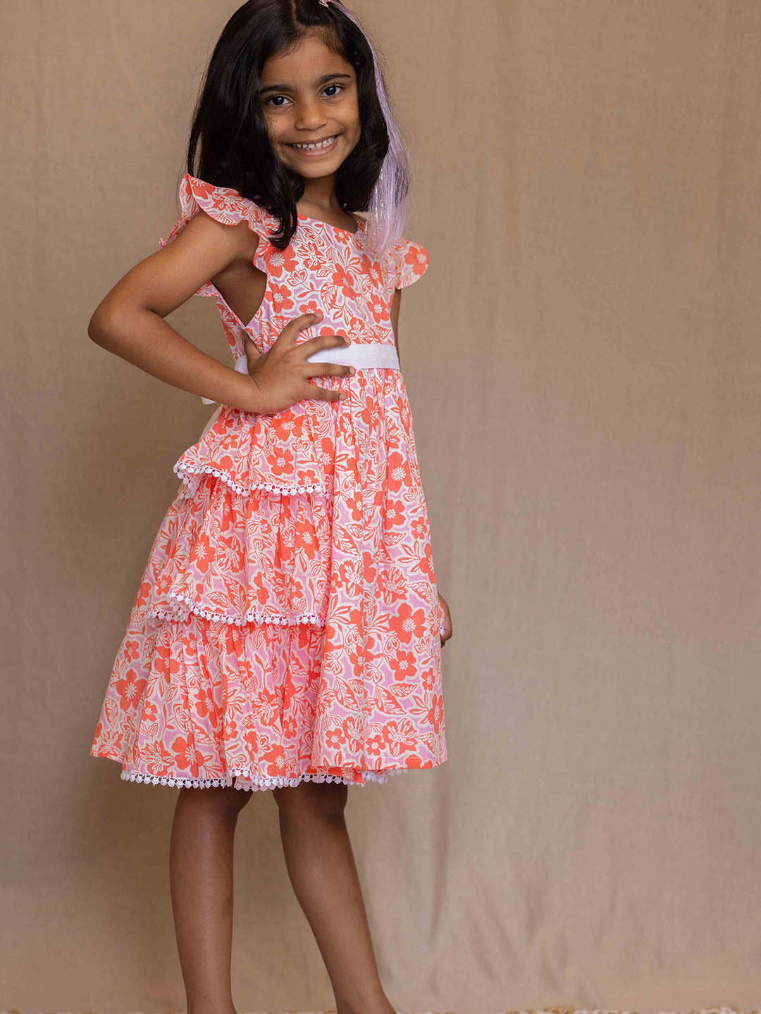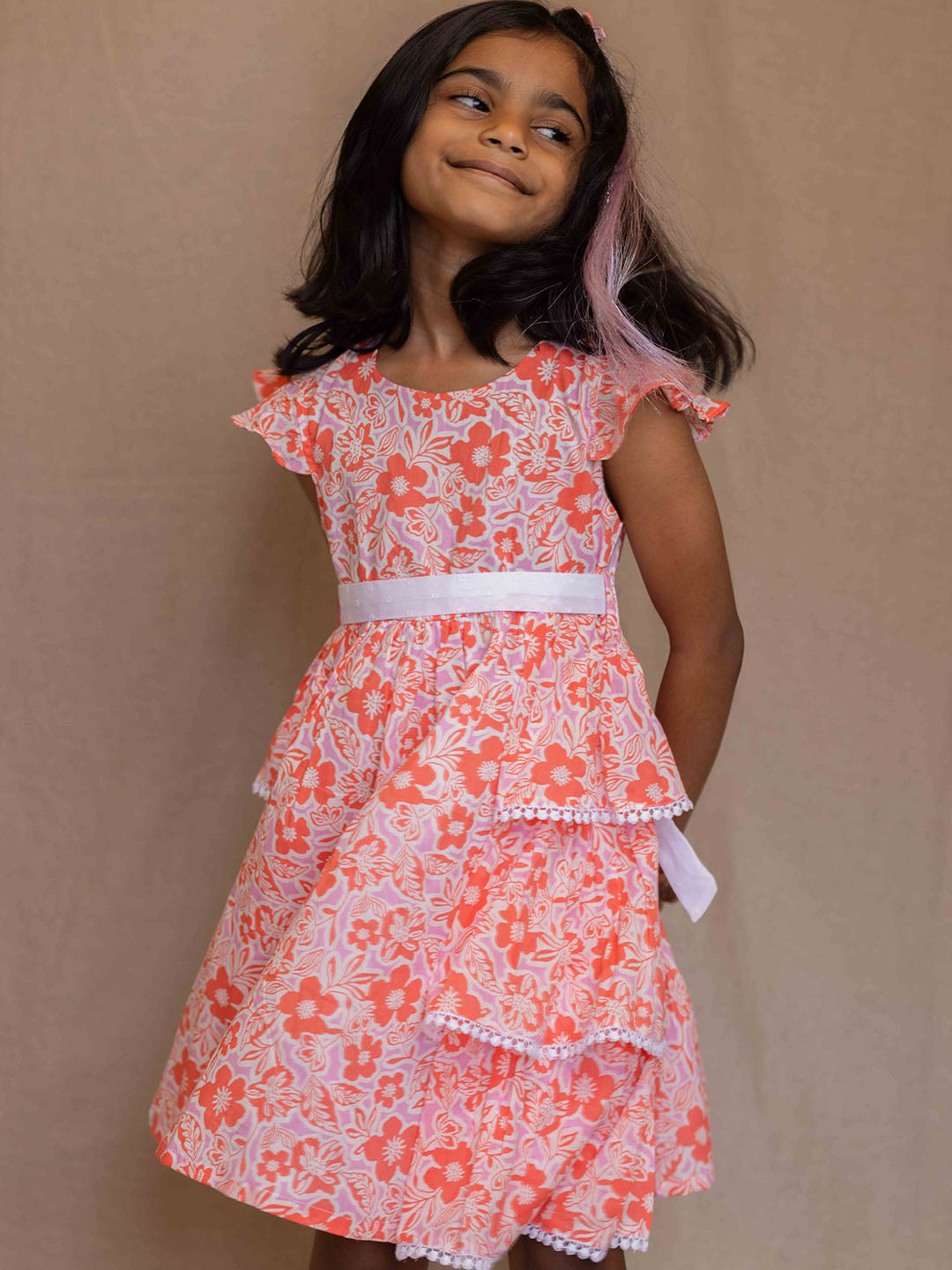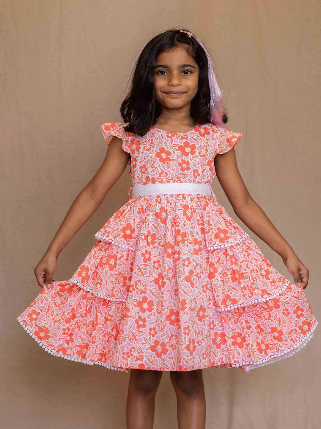 This adorable cotton frock features a charming orange floral print and comes with a soft cotton lining for added comfort. The dress is designed with tapered frill sleeves and a contrasting white belt that adds a stylish touch. The highlight of this frock is the 3 layered frills on each side, beautifully accented with contrasting white lace, giving it a delightful and elegant look.
