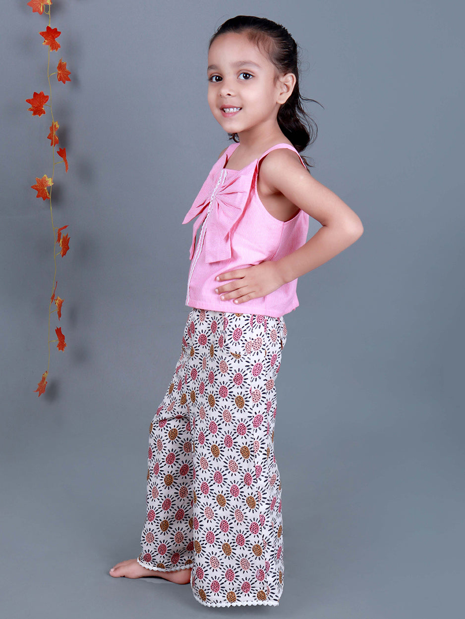 Introducing our Pink Top and Printed Palazzo Set – a charming ensemble designed to add flair to your little one's wardrobe.