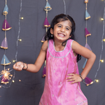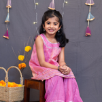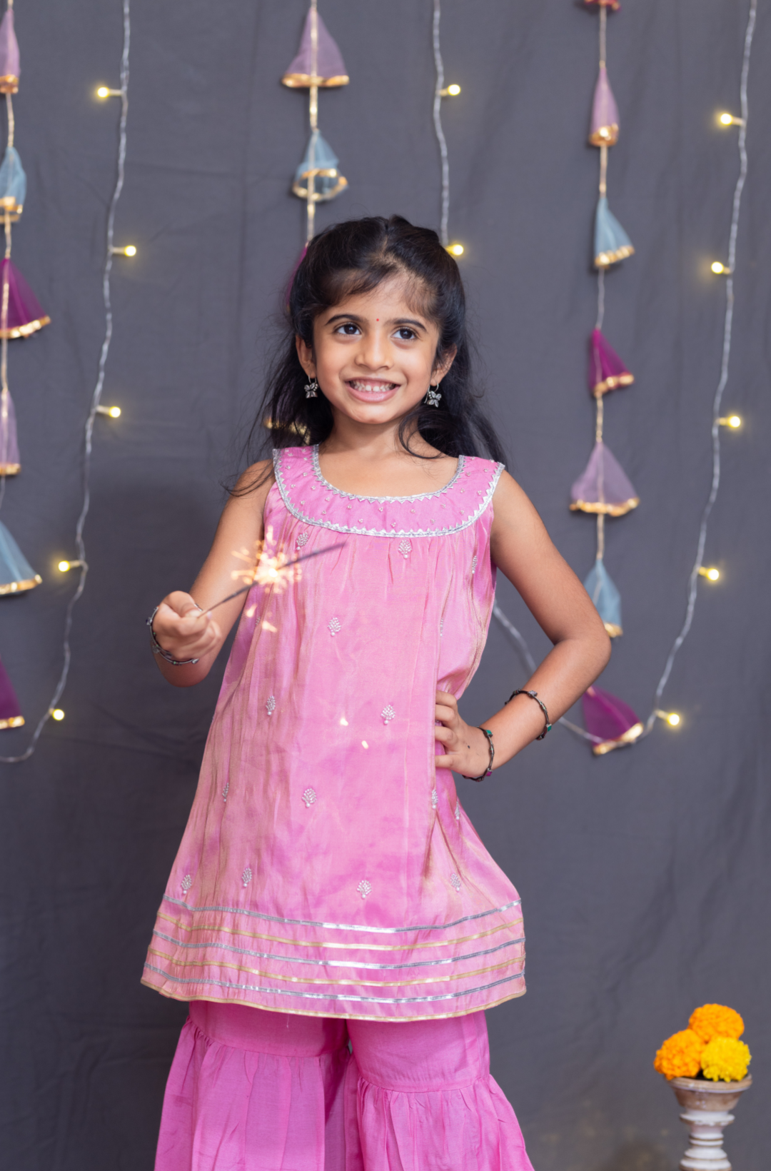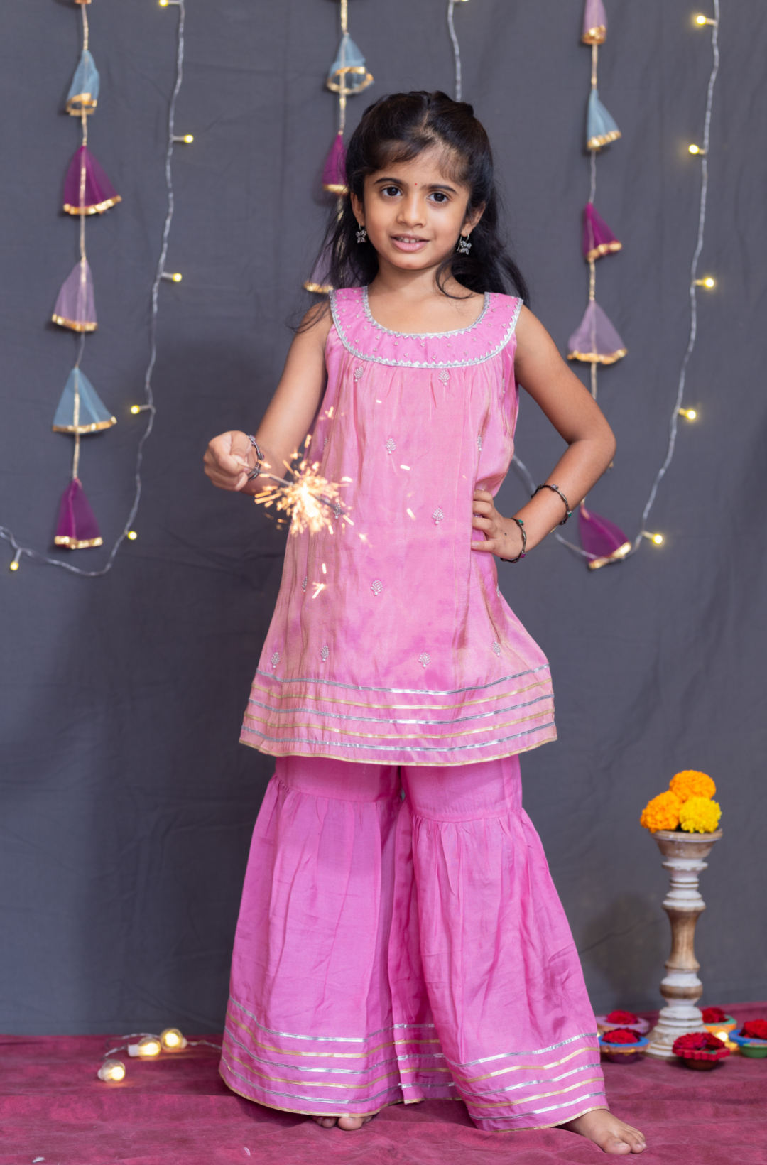 Coordinated Sharara: Matching pink sharara with an elasticated waist and gota lace detailing for a seamless, festive look.