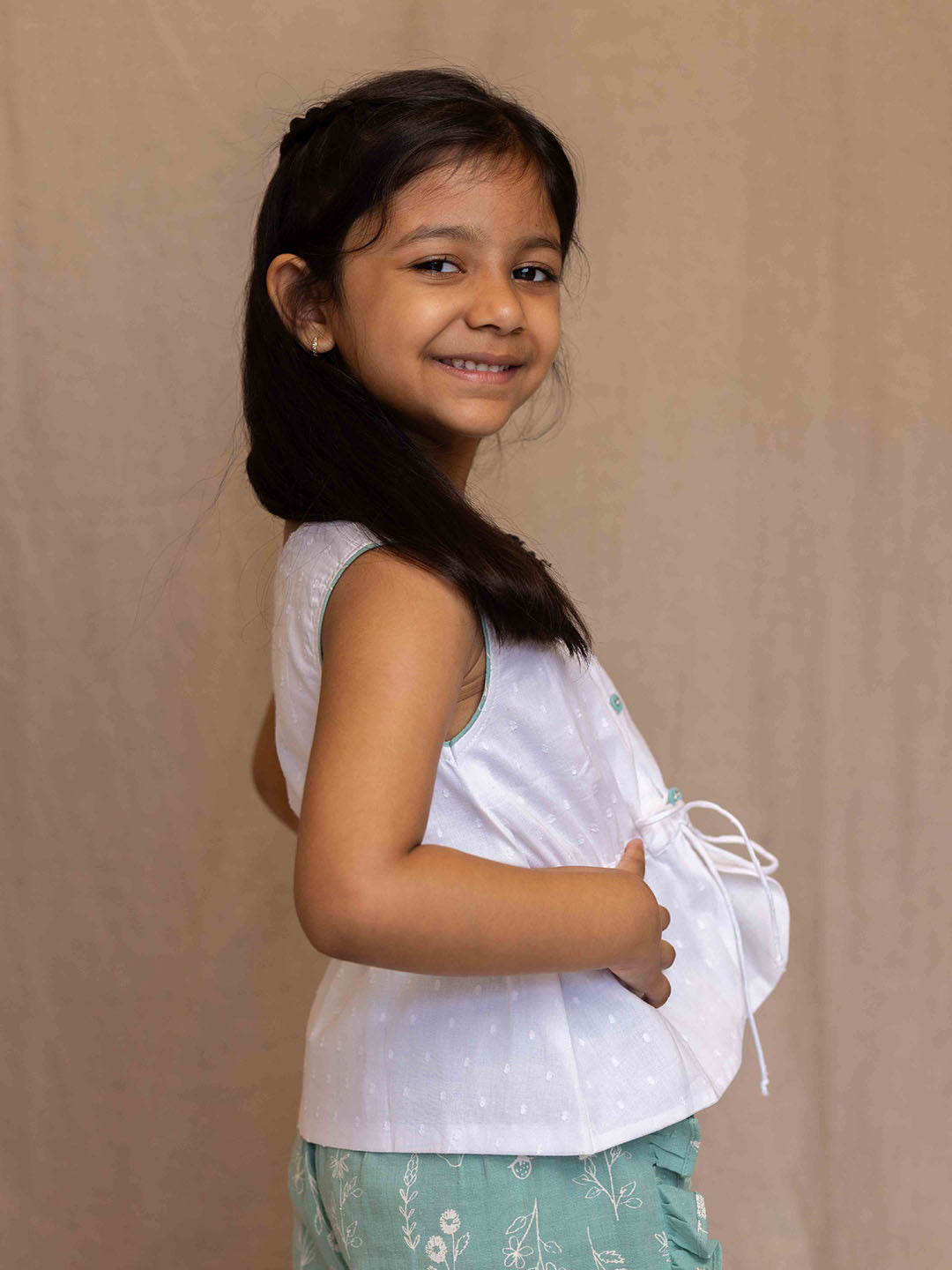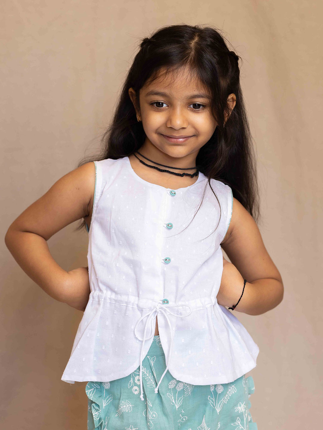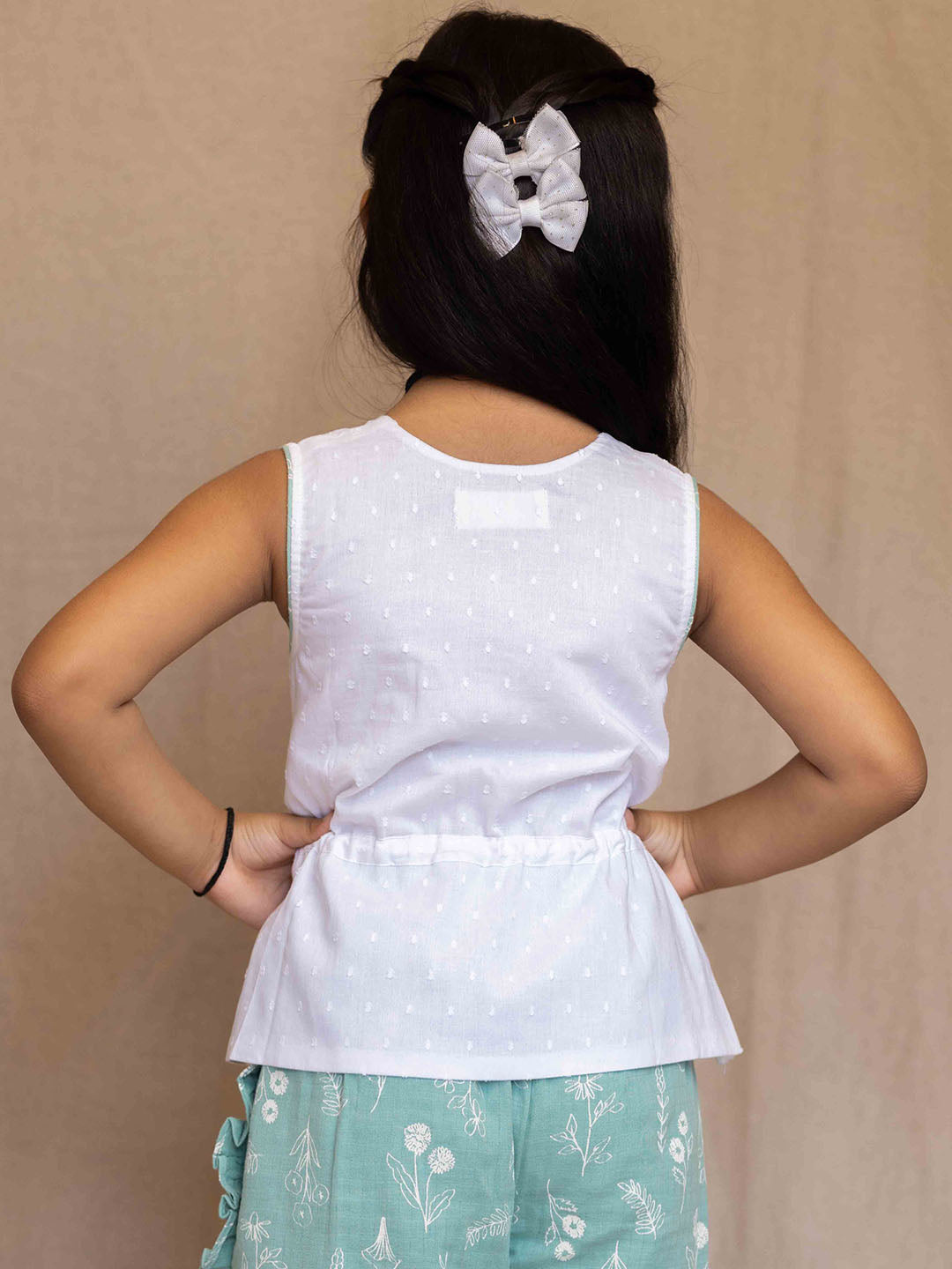 his adorable white dobby peplum top is crafted from pure cotton with a soft cotton lining, offering both comfort and style. Contrast piping on the armholes and a cute drawstring add charming details, while the contrast fabric buttons with loop closure create a perfect match for any printed pants. A versatile and stylish choice for a range of looks!