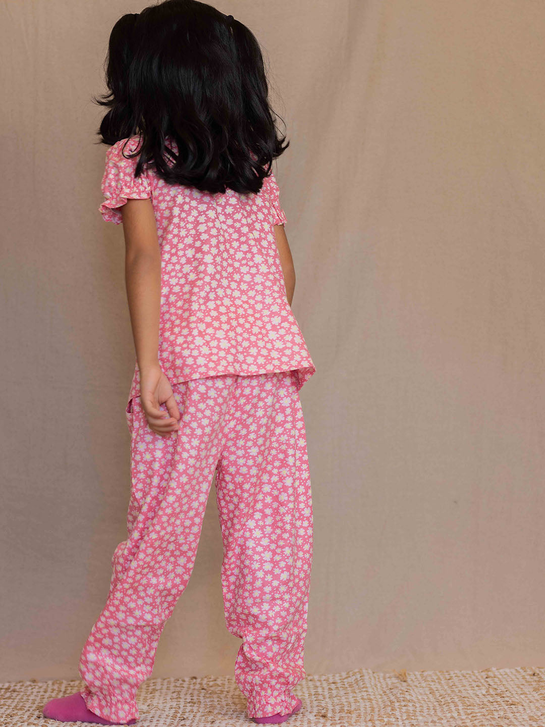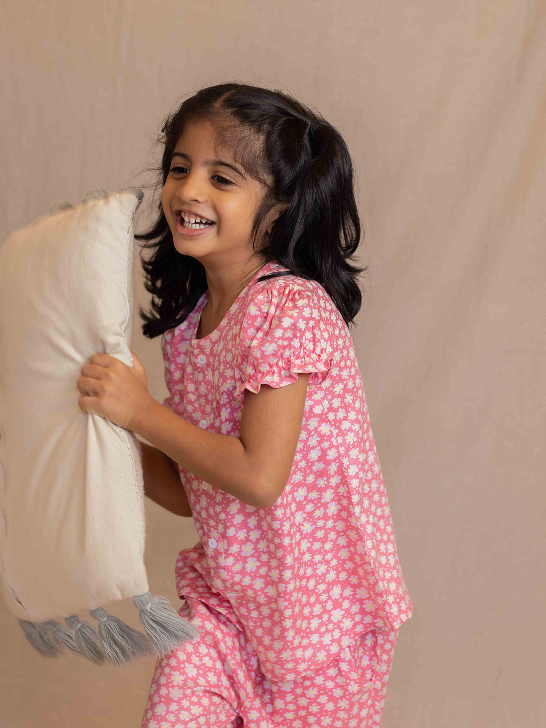 This charming pink nightsuit for girls features an all-over flower print, perfect for adding a touch of fun to bedtime. The top comes with a gathered front panel and puff sleeves, giving it an adorable, playful look. The elasticated pants offer a comfortable fit and are finished with a cute frill at the bottom hem. Made for cozy nights, this set combines comfort with cute design elements, making it a bedtime favorite.