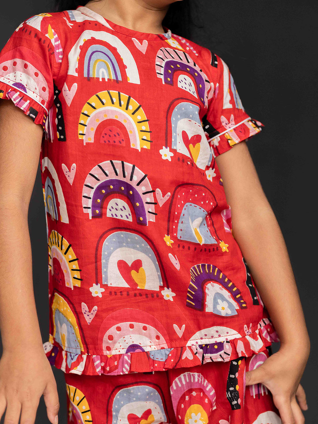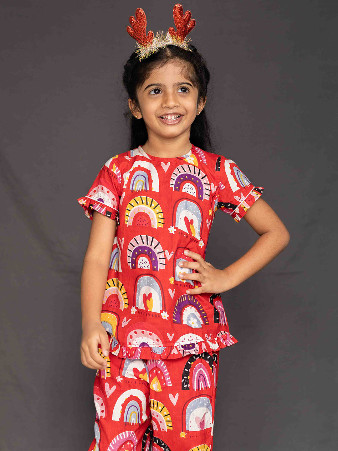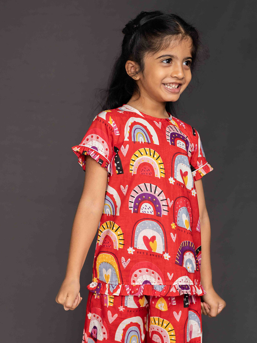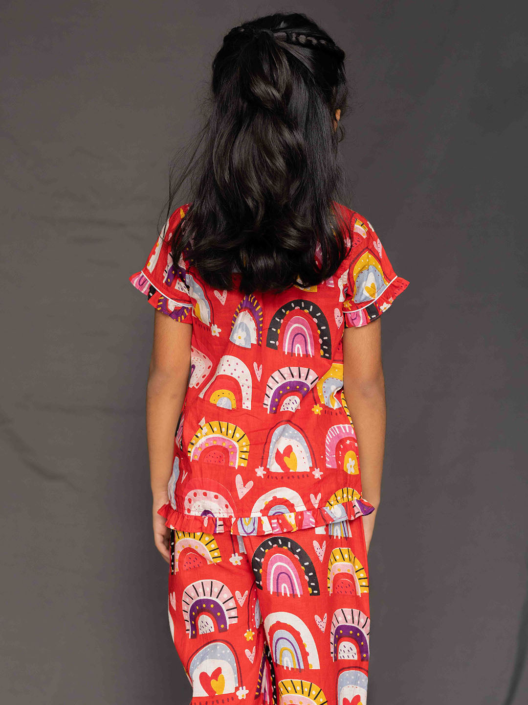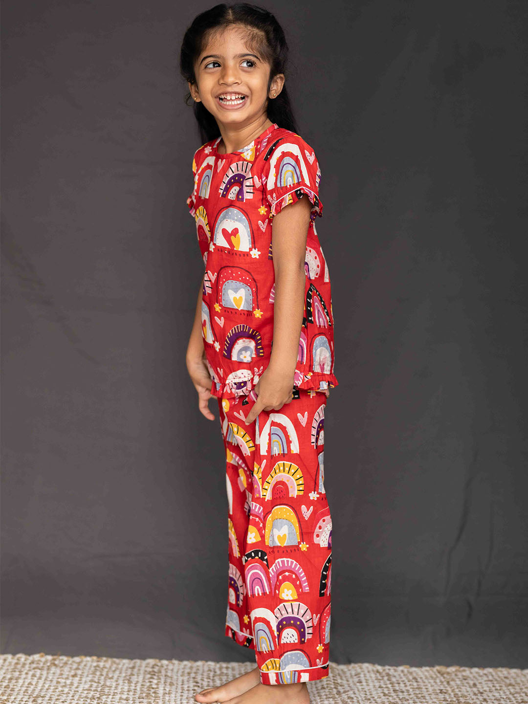 Add a pop of color to bedtime with this cheerful bright red pajama set, featuring an all-over rainbow print that’s sure to delight. The short-sleeve top is adorned with self-fabric frills on the sleeves and base hemline, adding a playful touch. Paired with full-length pants featuring an elasticated waistband and handy pockets, this set combines style with practicality. Contrast white piping on the sleeve edges and pant hems enhances the look, while the soft, breathable cotton fabric ensures maximum comfort for a cozy night’s sleep.