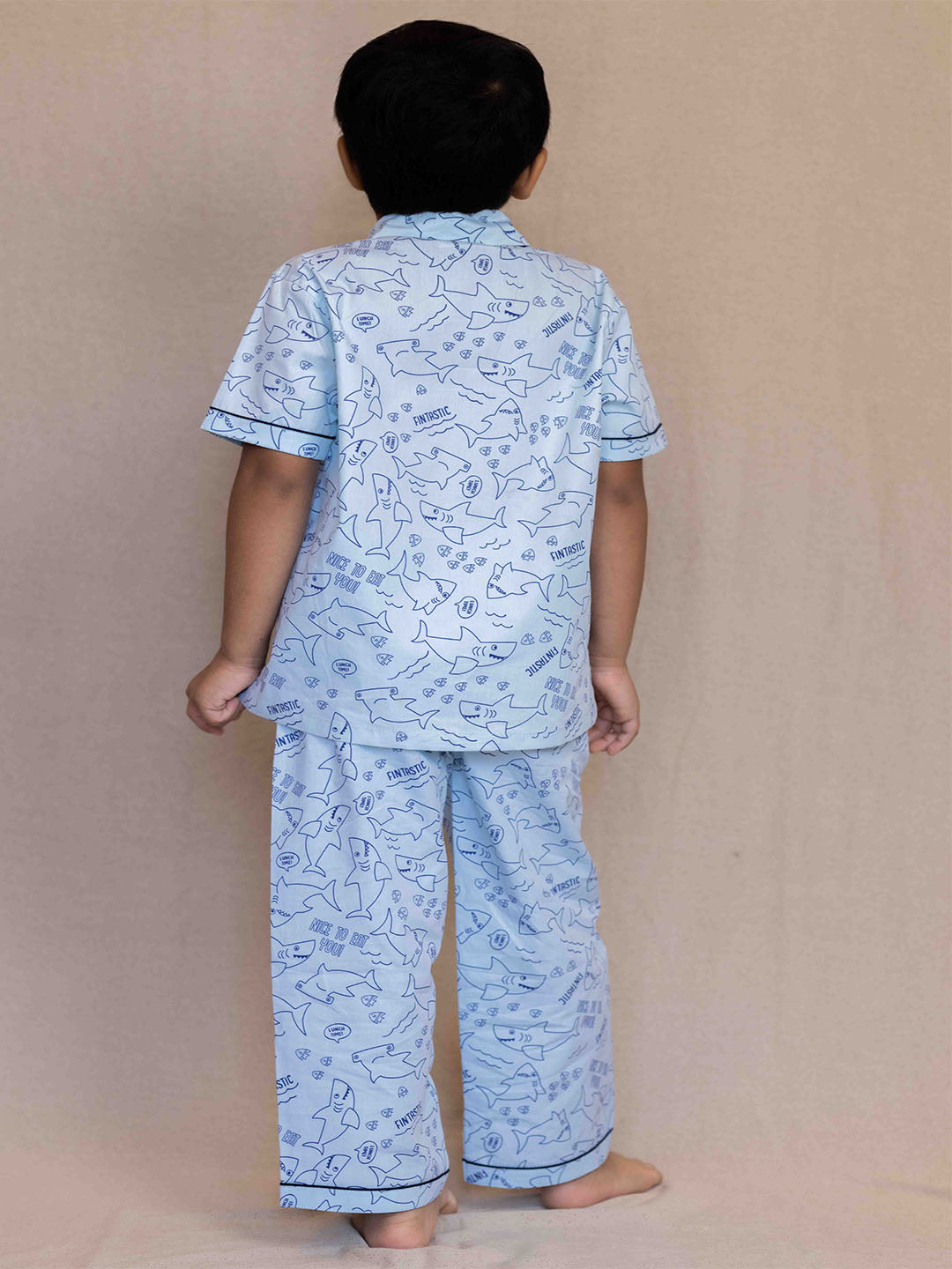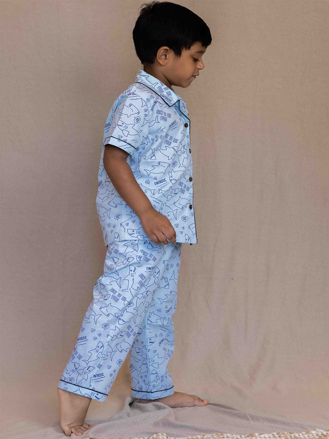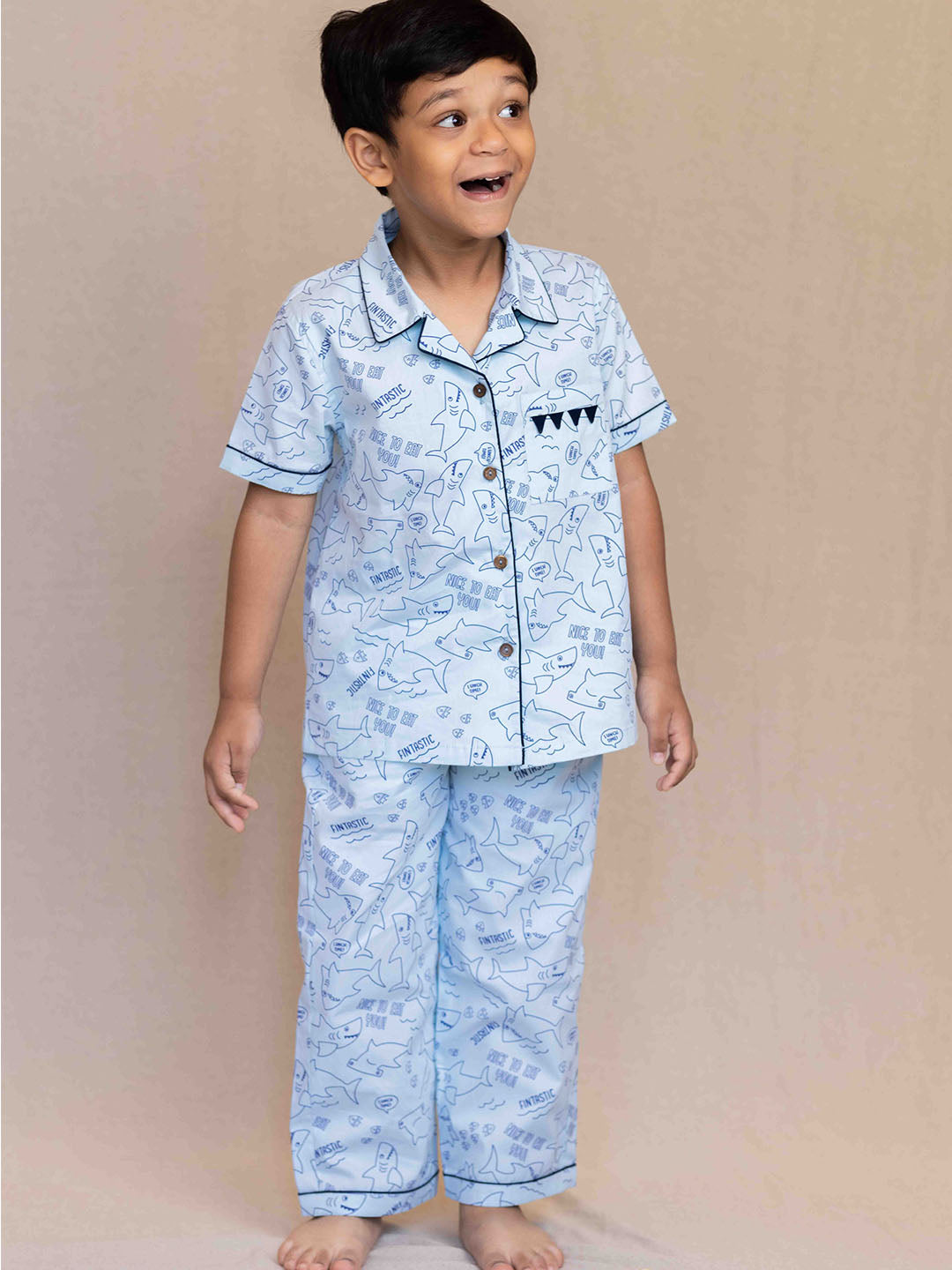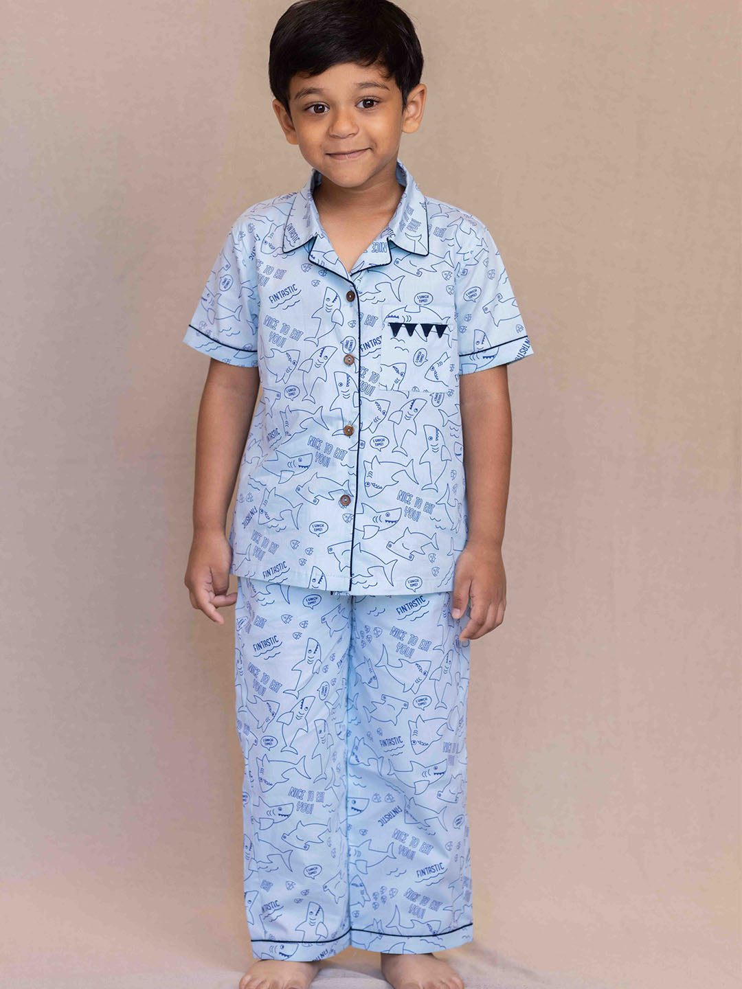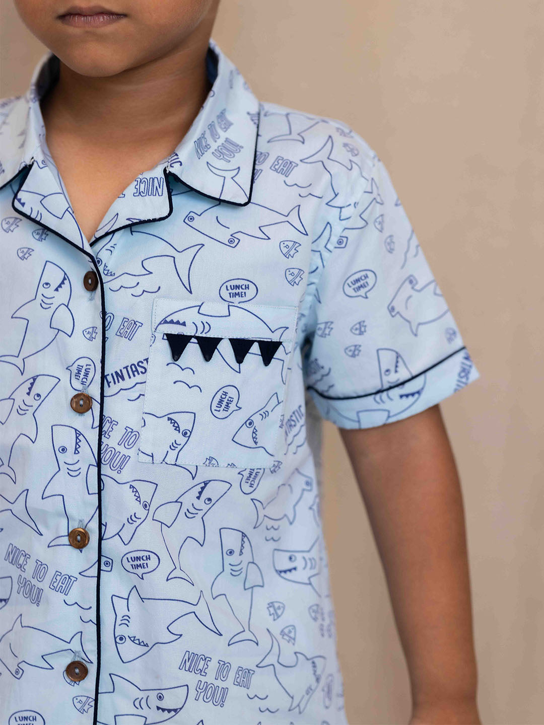 Dive into comfort with our adorable Shark-themed Pajama Set! Made from soft cotton fabric, this set includes a half-sleeve shirt and full-length pants, perfect for lounging or bedtime. The shirt features a notch collar, wooden buttons, and contrast navy blue piping. A fun 3D shark teeth detail on the pocket adds a playful touch, while the all-over shark print is sure to delight kids.