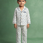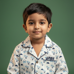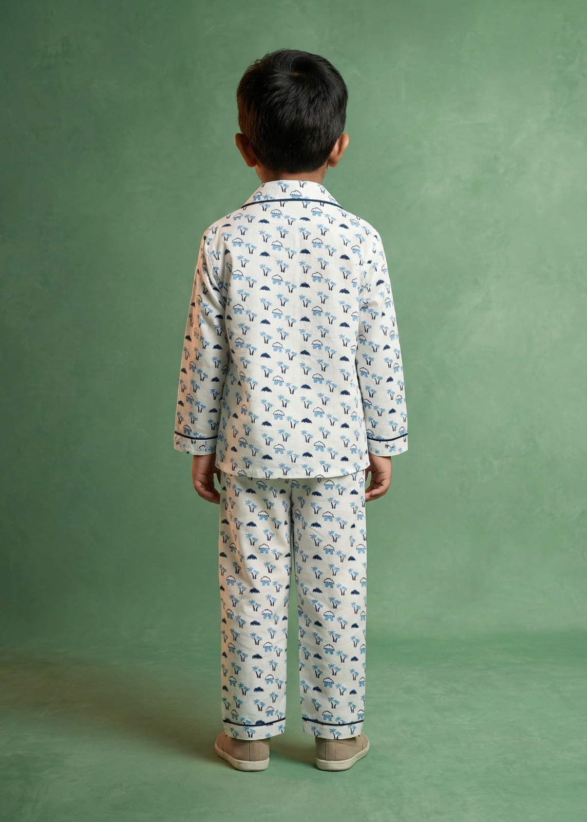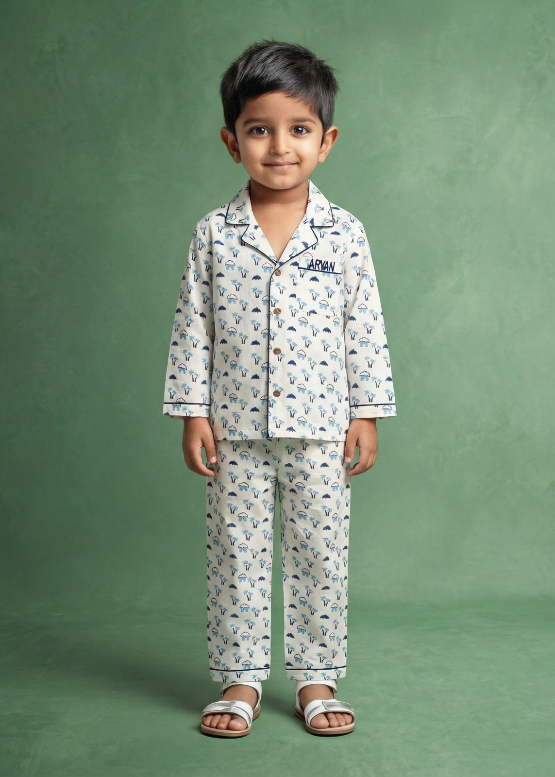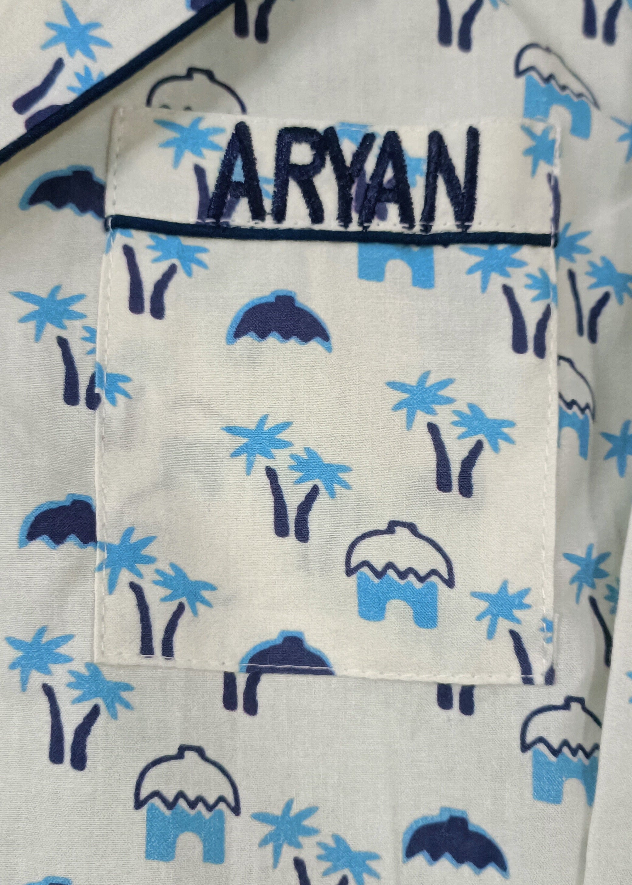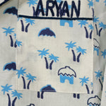 • Cotton unisex pajamas with tropical palm tree print, full-sleeve notch-collar shirt, contrast piping, and option to personalise the top.