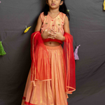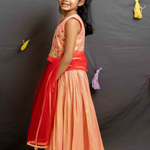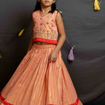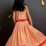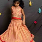 Peach Shimmer Lehenga crafted in cotton lurex with cotton lining, featuring an elasticated waist, self-fabric frill, and a contrast red frill at the hem.