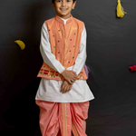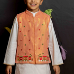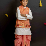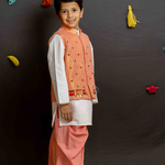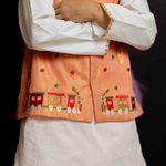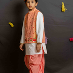 Peach Shimmer Bundi with cotton lining and elegant train embroidery, paired with the kurta for a festive ensemble.
