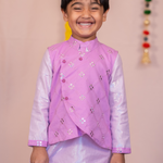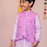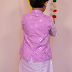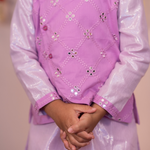 Mirror Work Bundi Jacket: Lilac bundi with all-over mirror work, mandarin collar, and cotton lining for a regal, festive look.