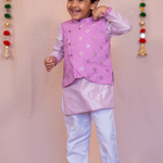 Pre-order Indian Wear: Elegant lilac kurta, pants, and mirror work bundi set – a perfect festive ensemble.